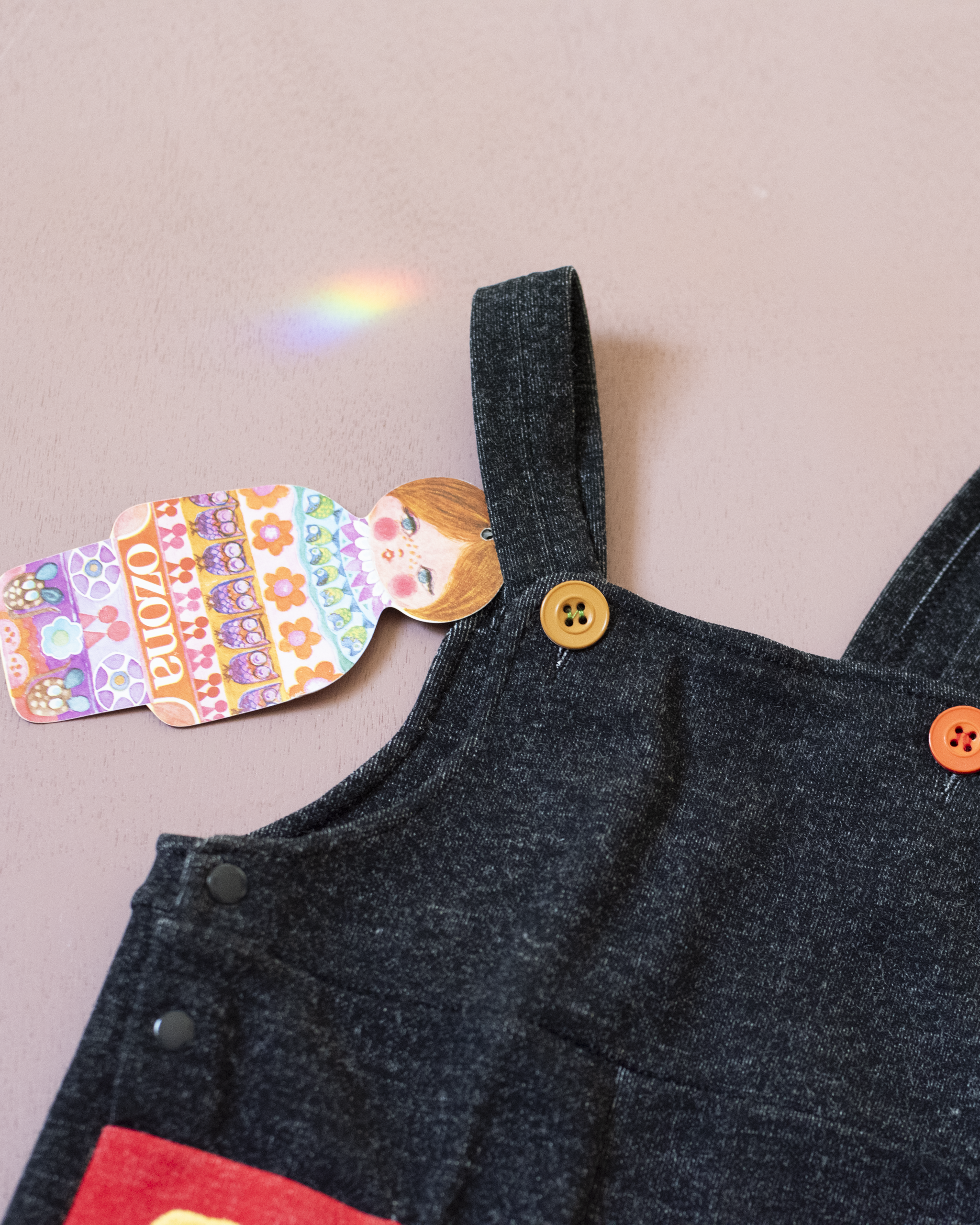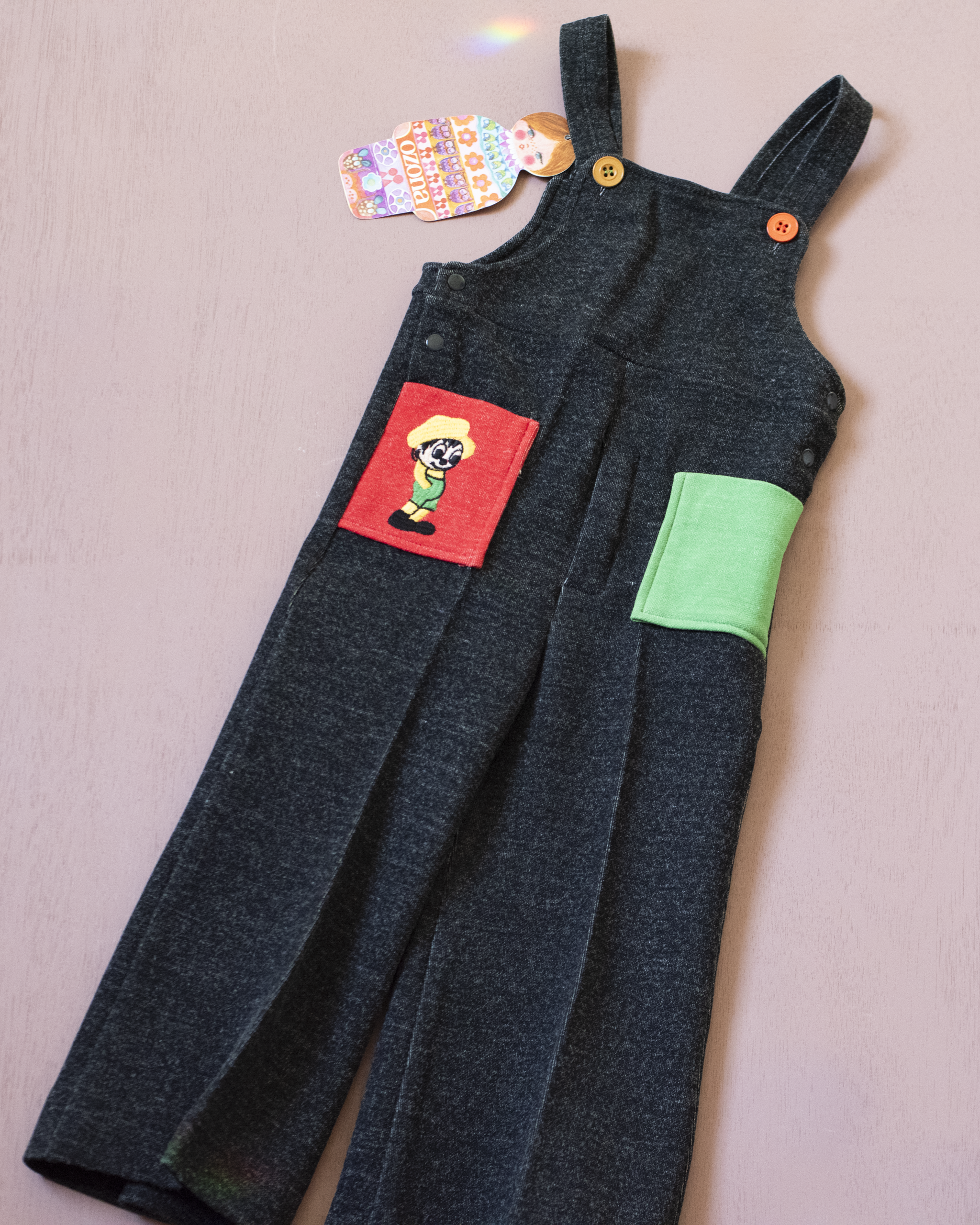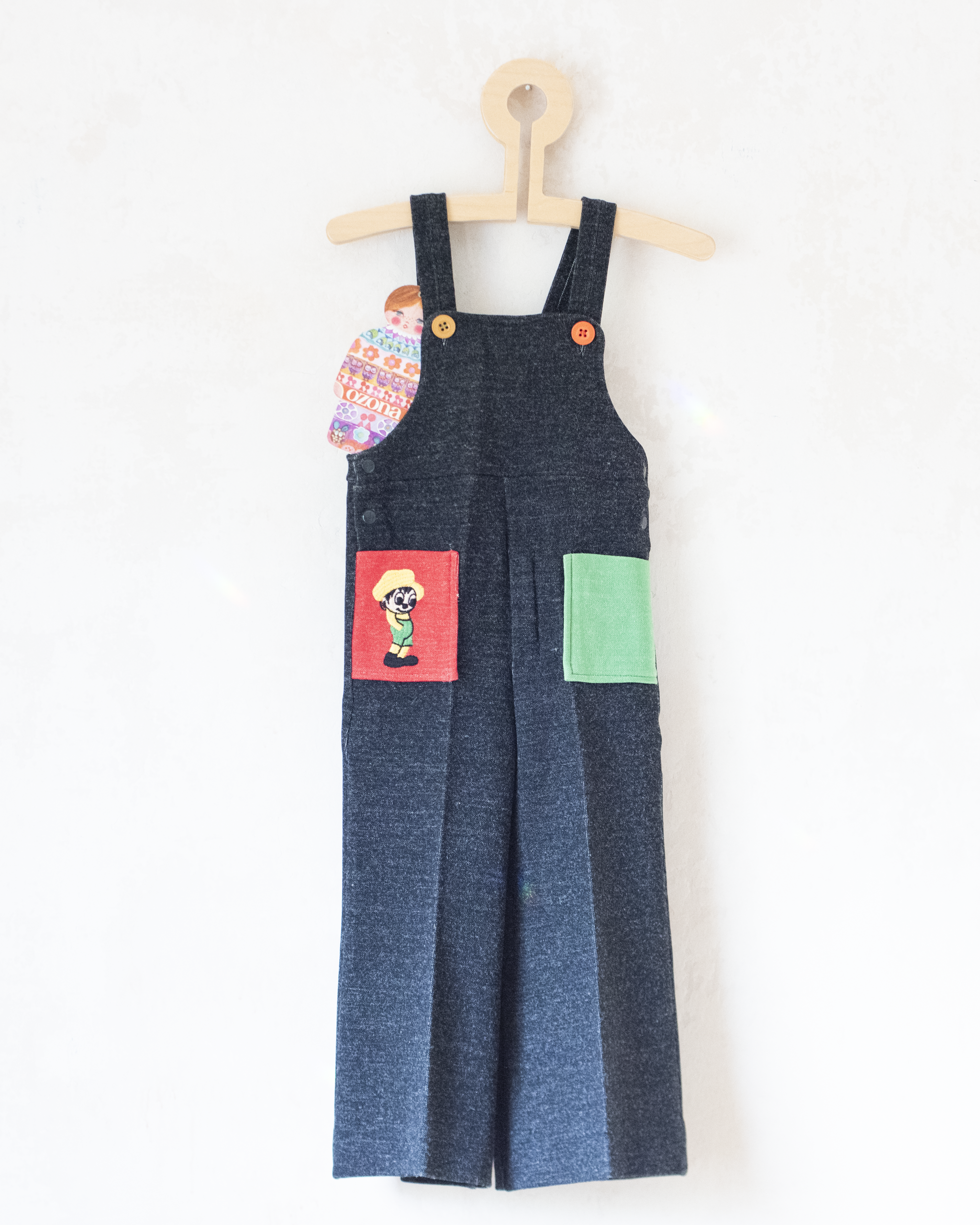 אוברול שחור עם כיסים צבעוניים ורקמת ילד | דד סטוק צרפתי מהסבנטיז | 18-24 חודשים