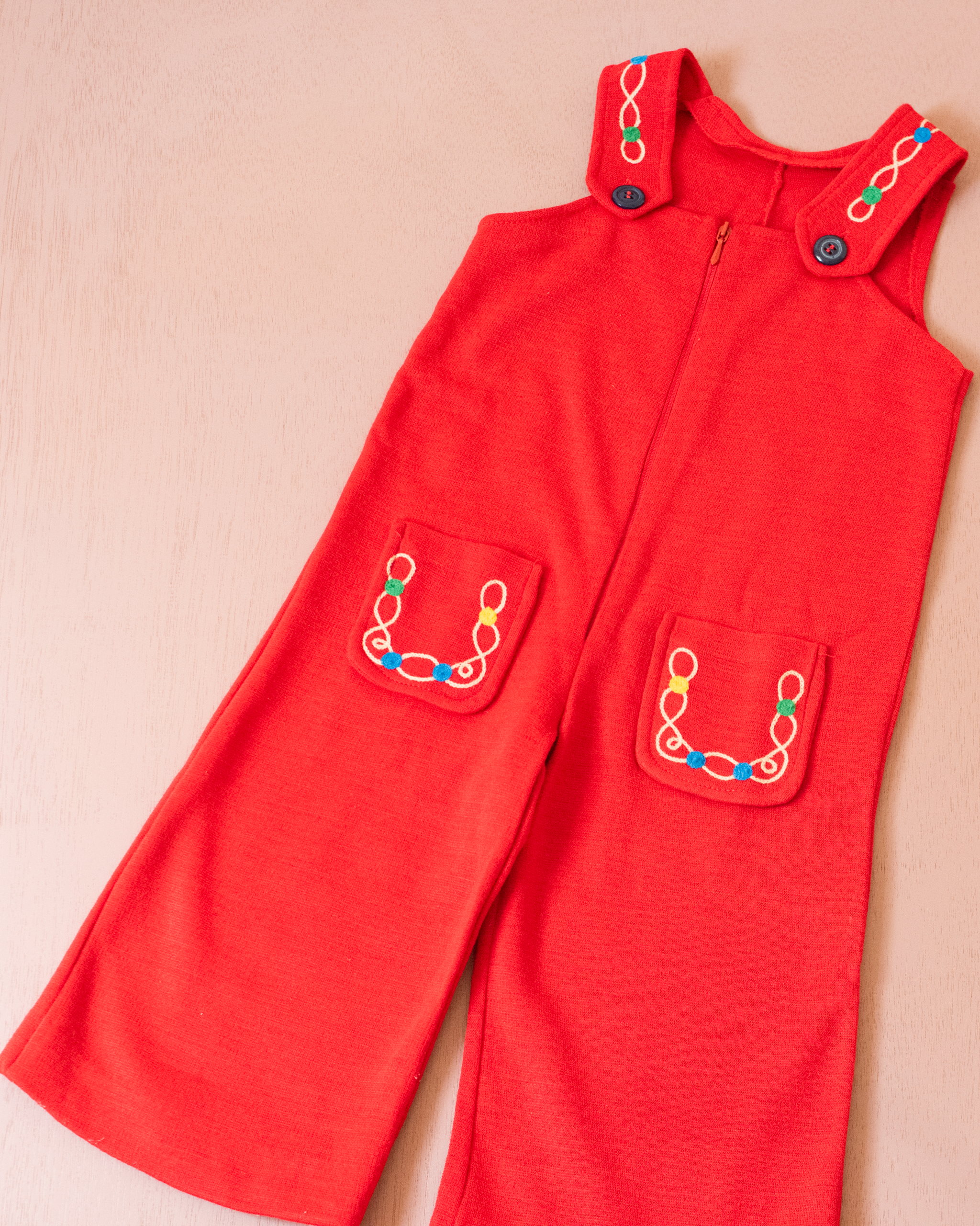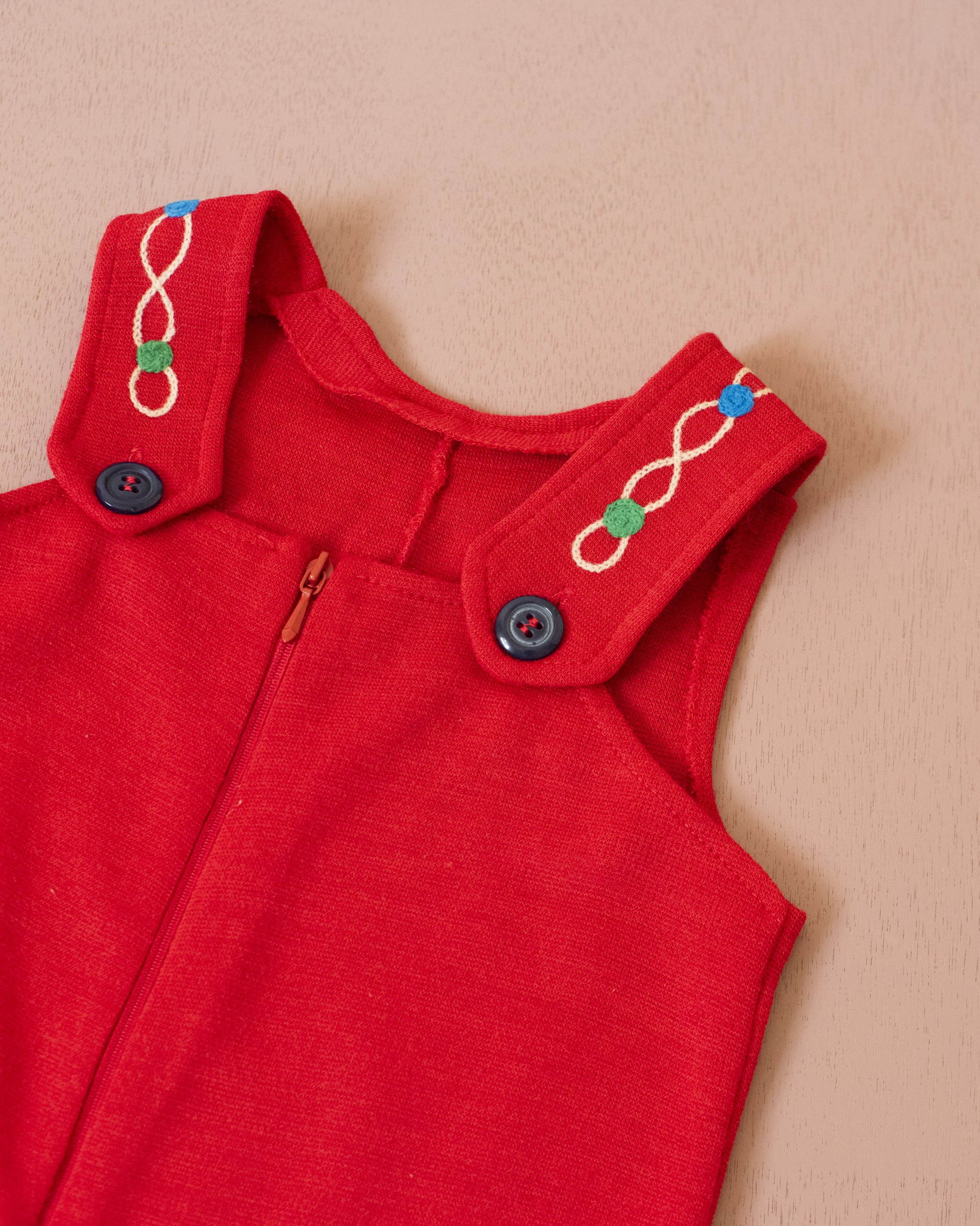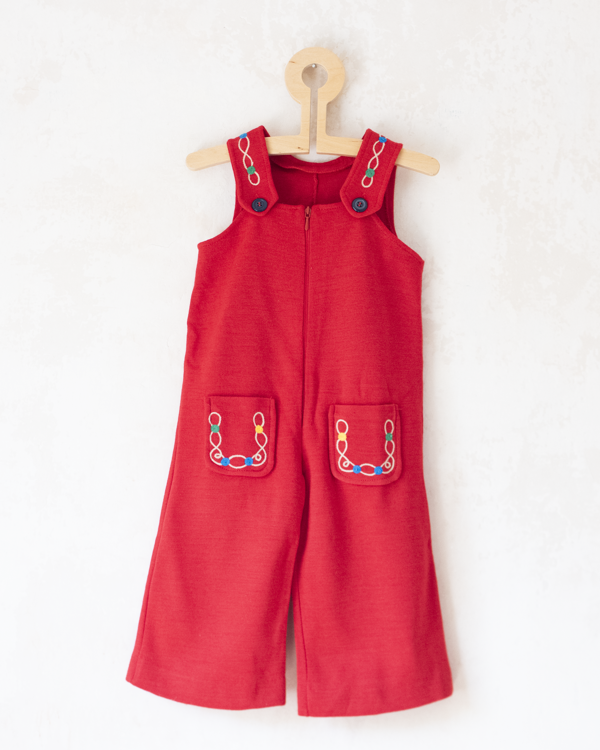 אוברול סרוג אדום עם רקמה צבעונית | דד סטוק צרפתי מהסבנטיז | 18-24 חודשים