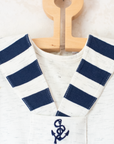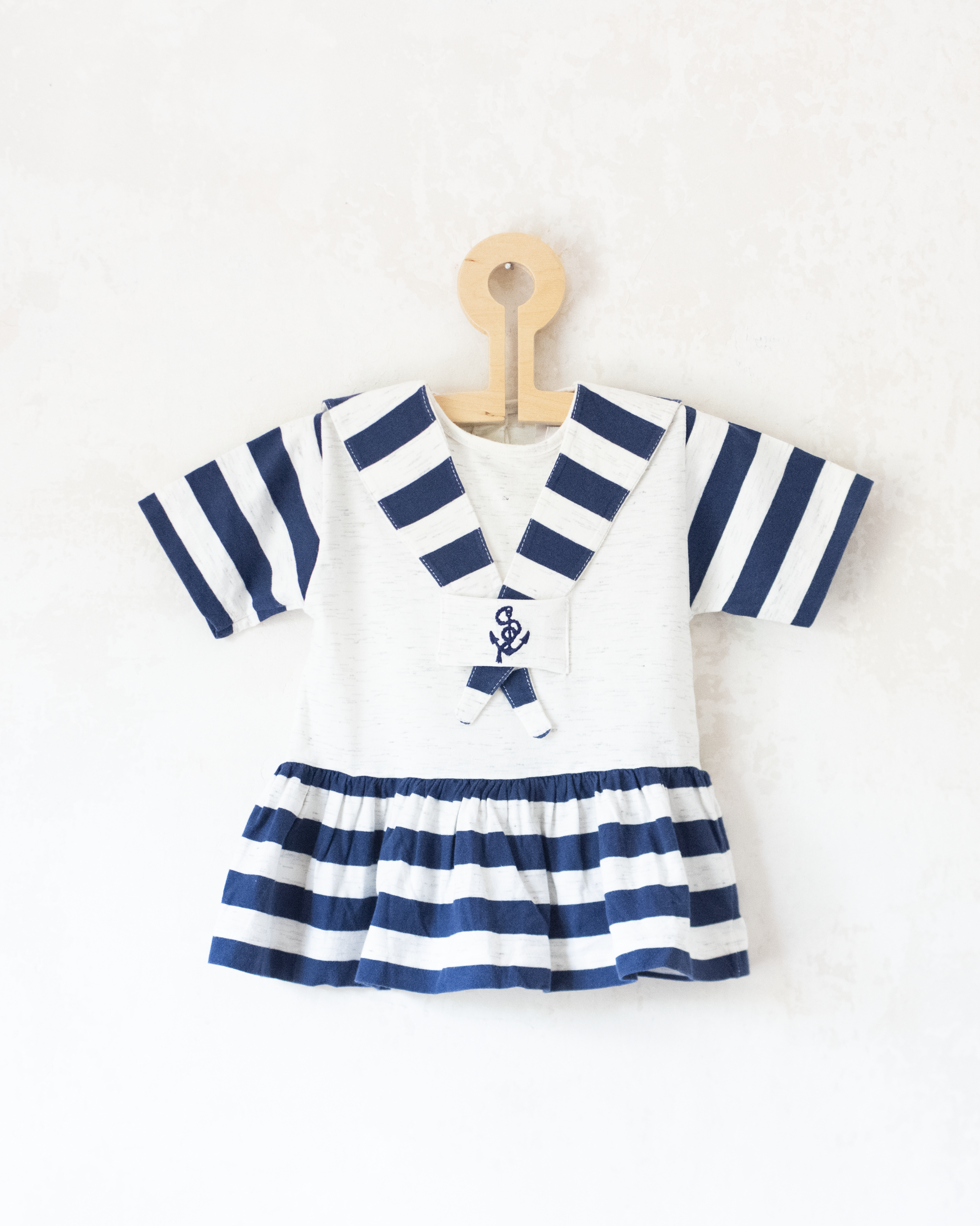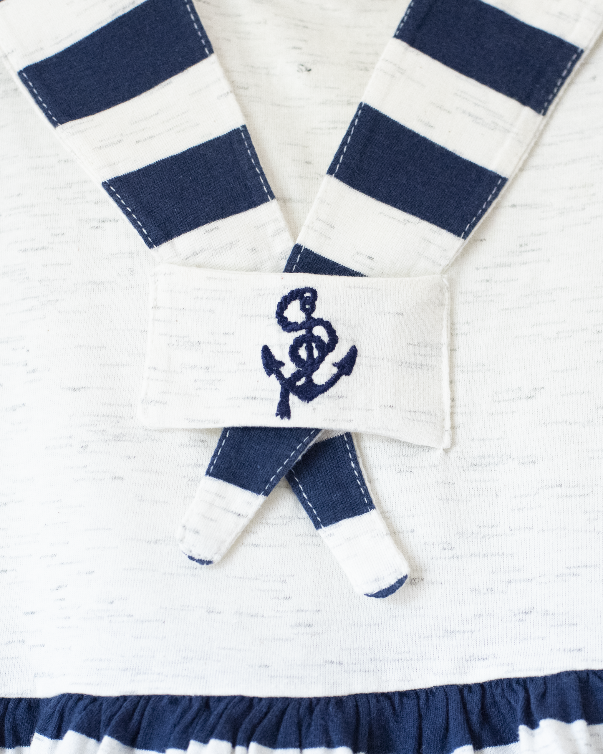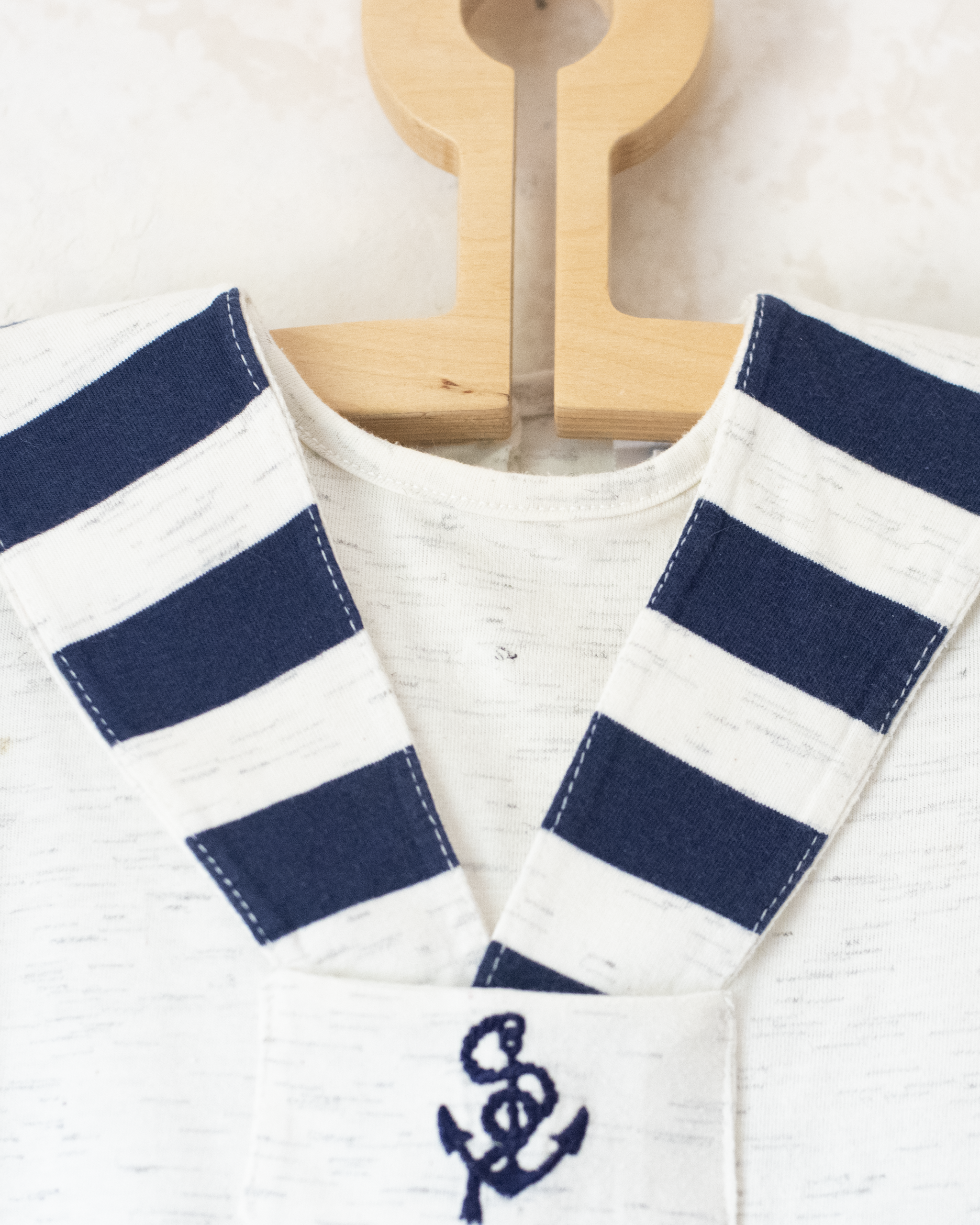 עם צווארון ימאים רחב המצטלב מלפנים ועוגן רקום