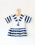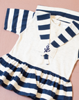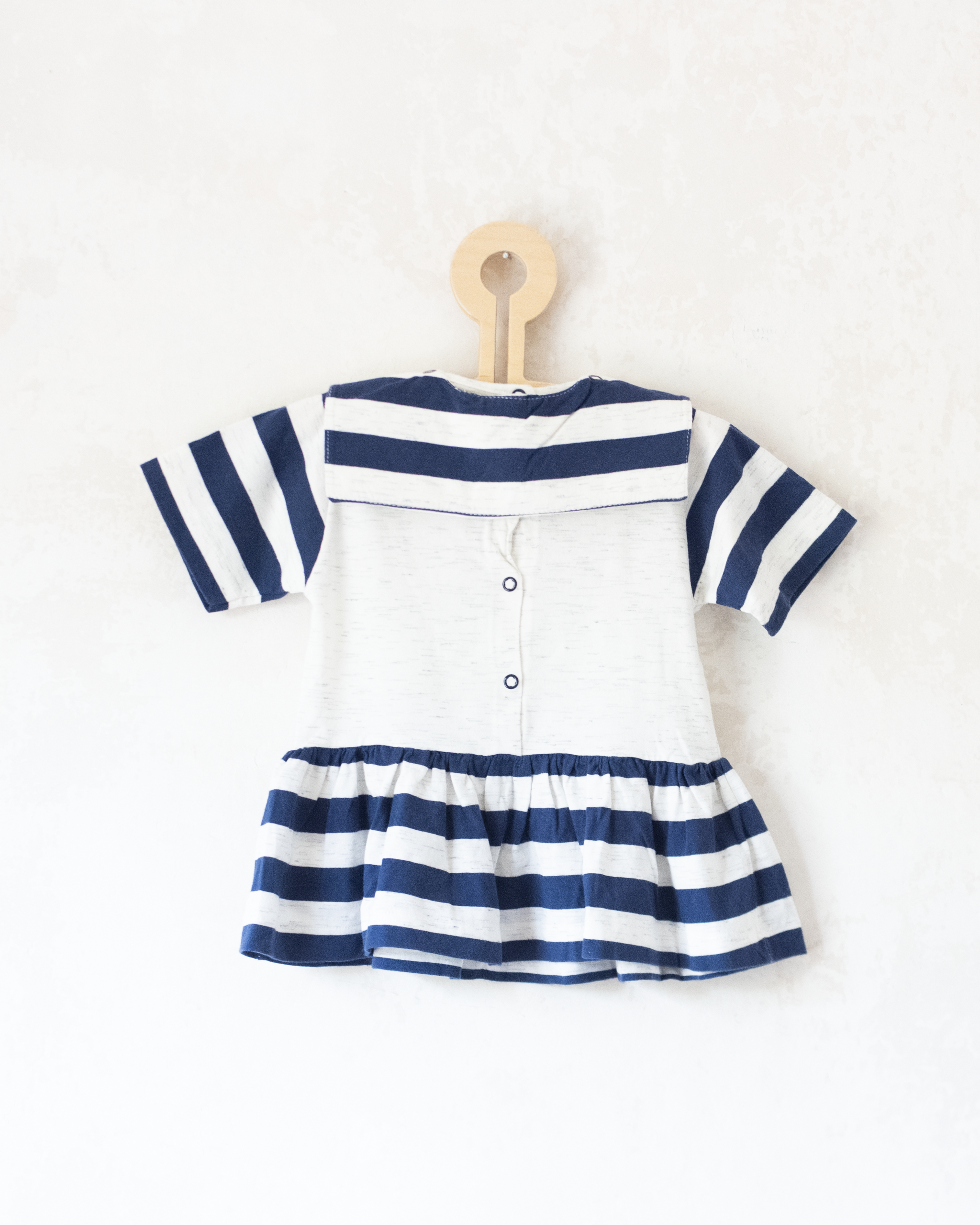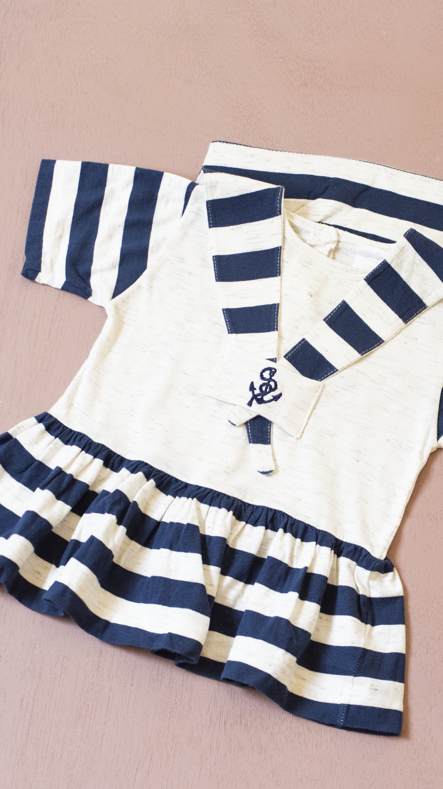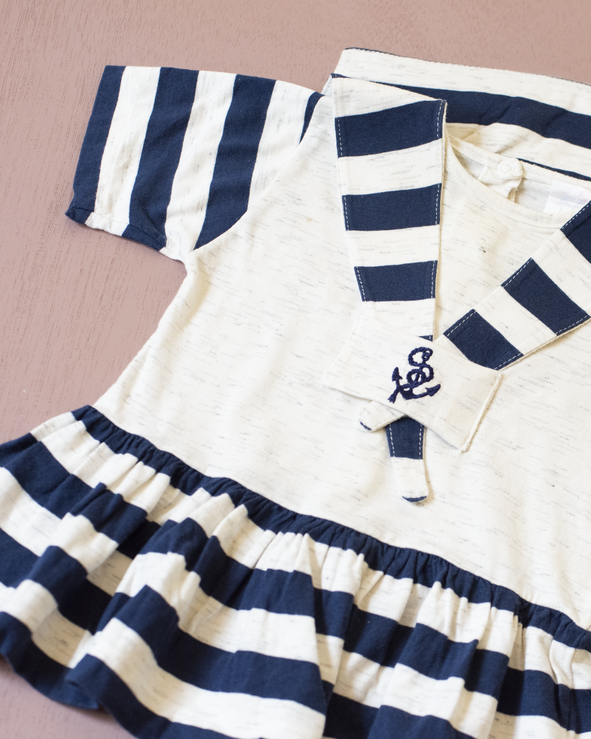 עם צווארון ימאים רחב המצטלב מלפנים ועוגן רקום