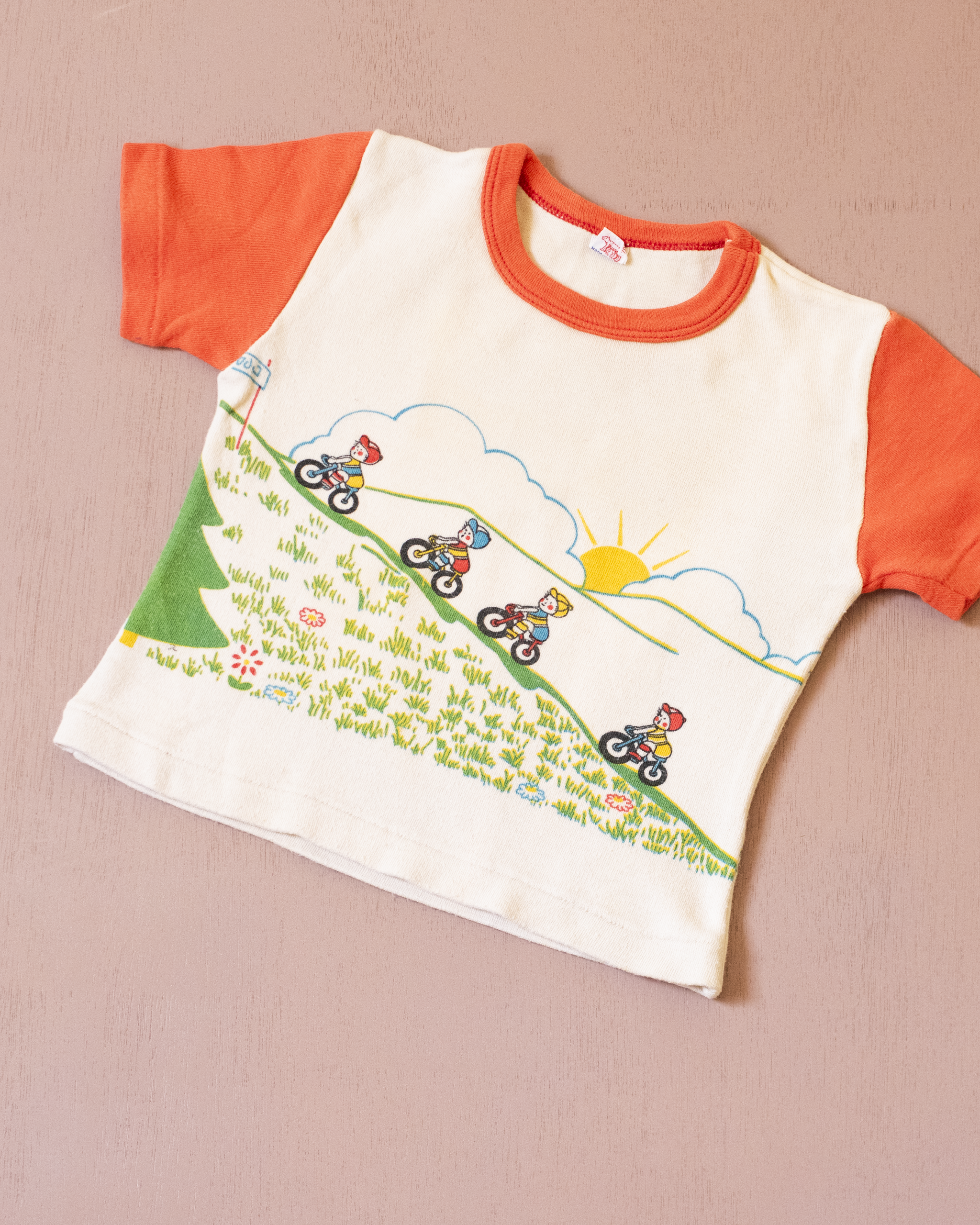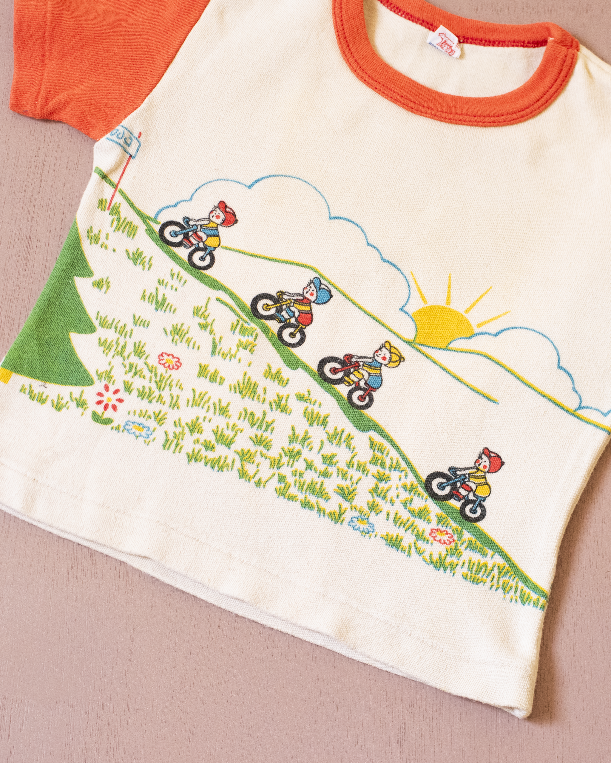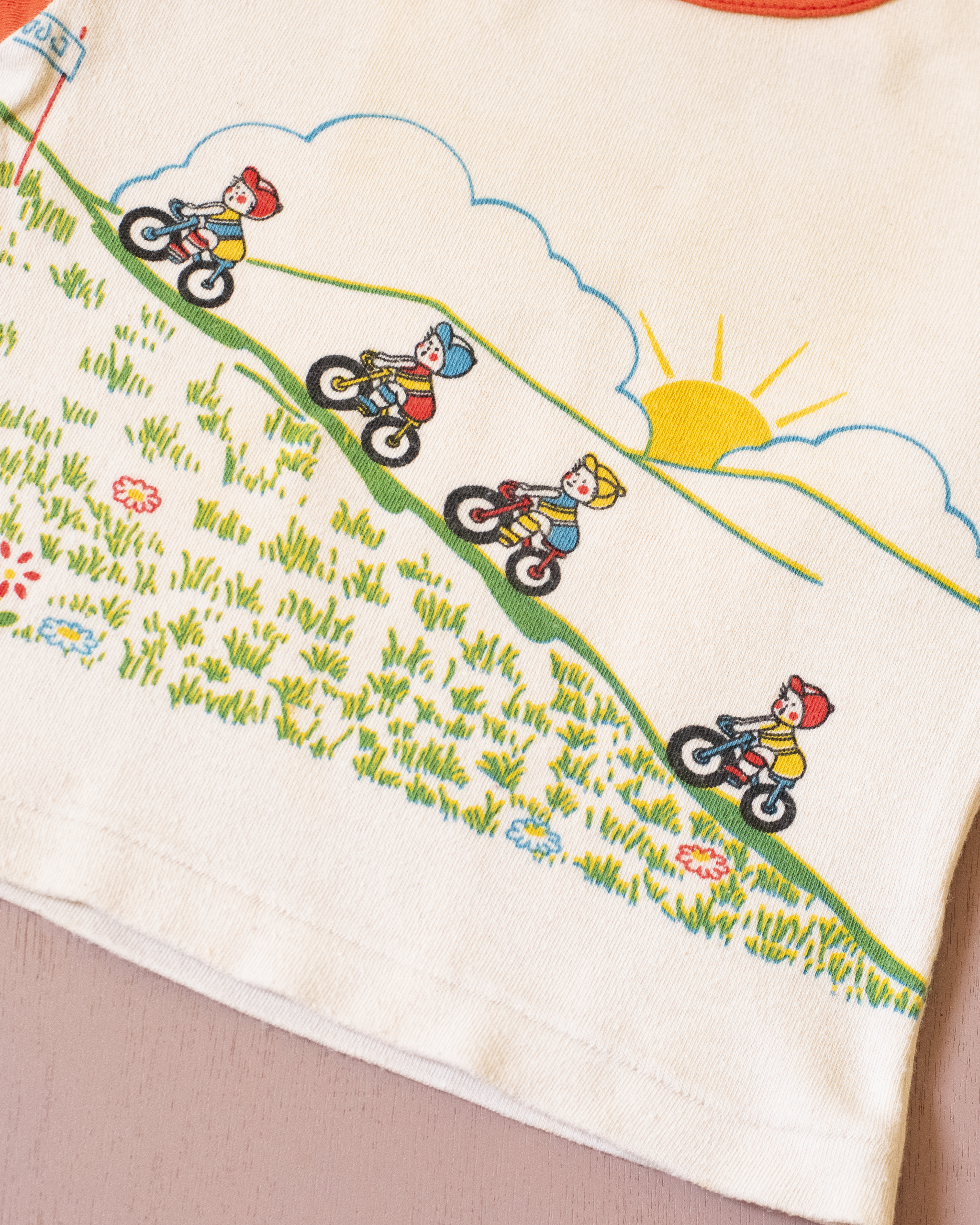 בצבע בז׳ עם הדפס צבעוני מלפנים ומאחור של ילדים רוכבים במעלה הר