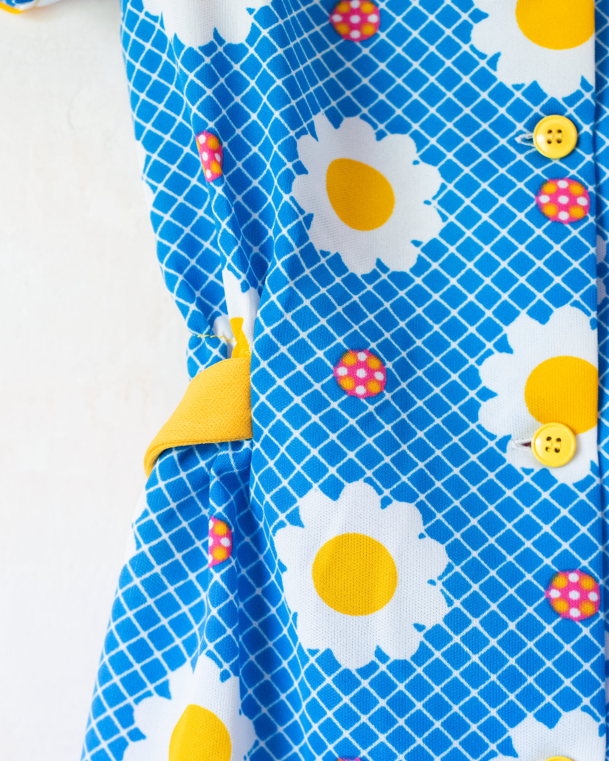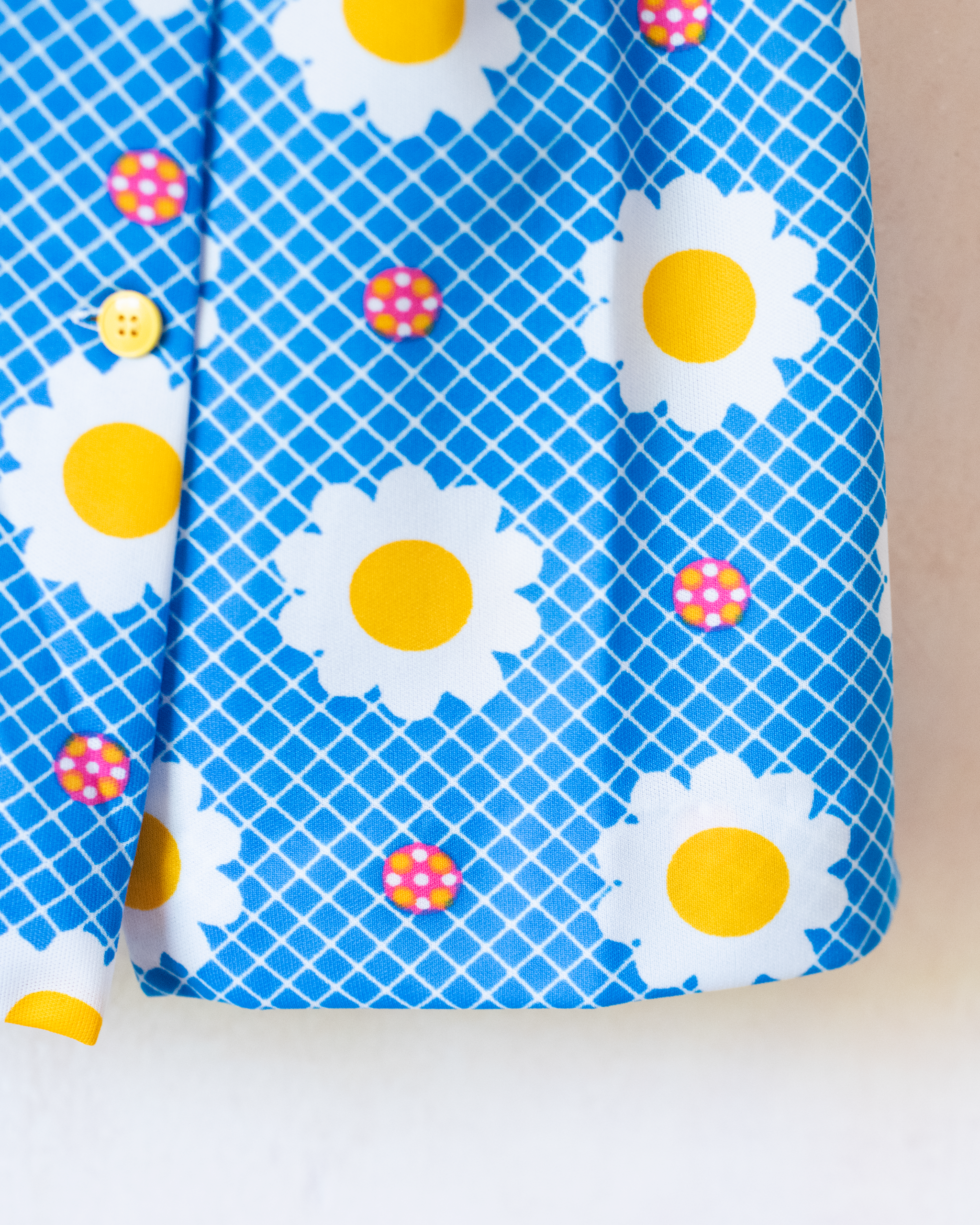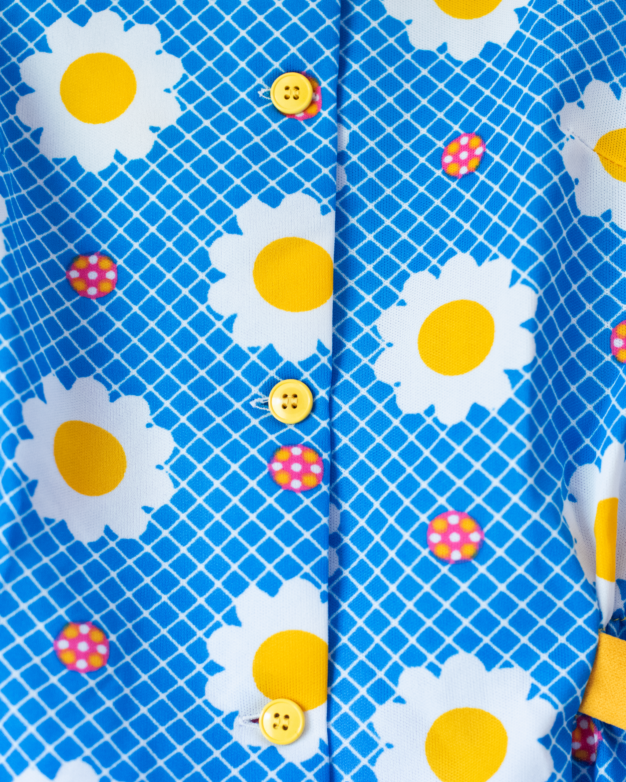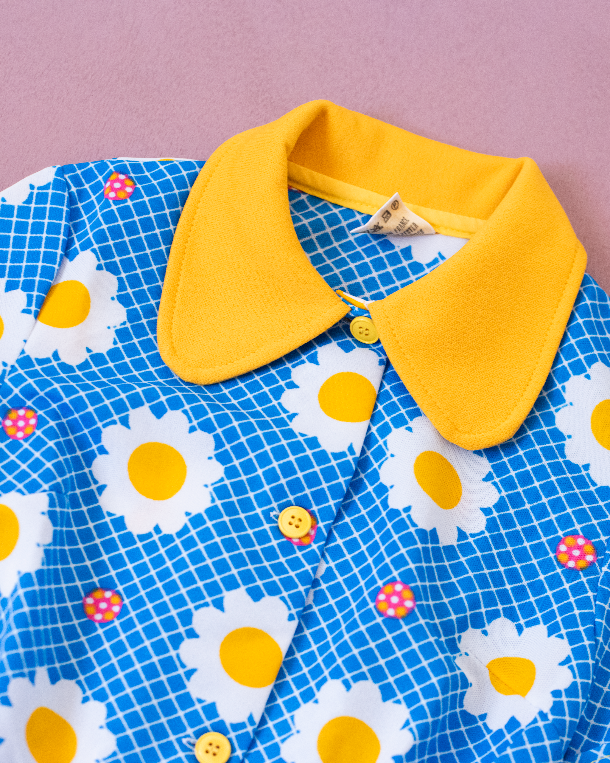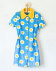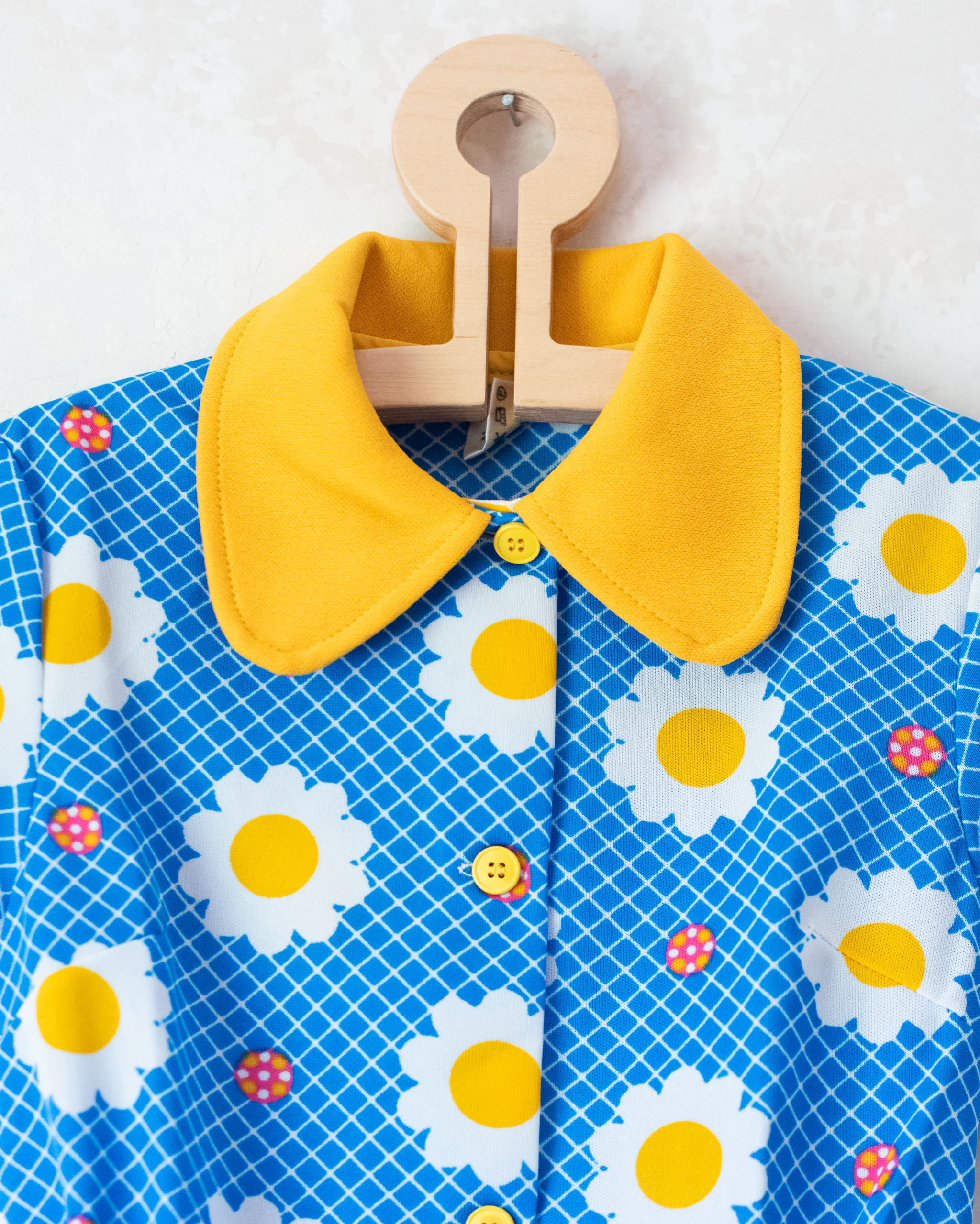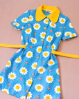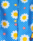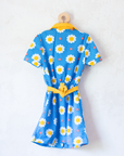 מבד סינטטי, בצבע כחול ולבן עם פרחים וצווארון רחב צהוב