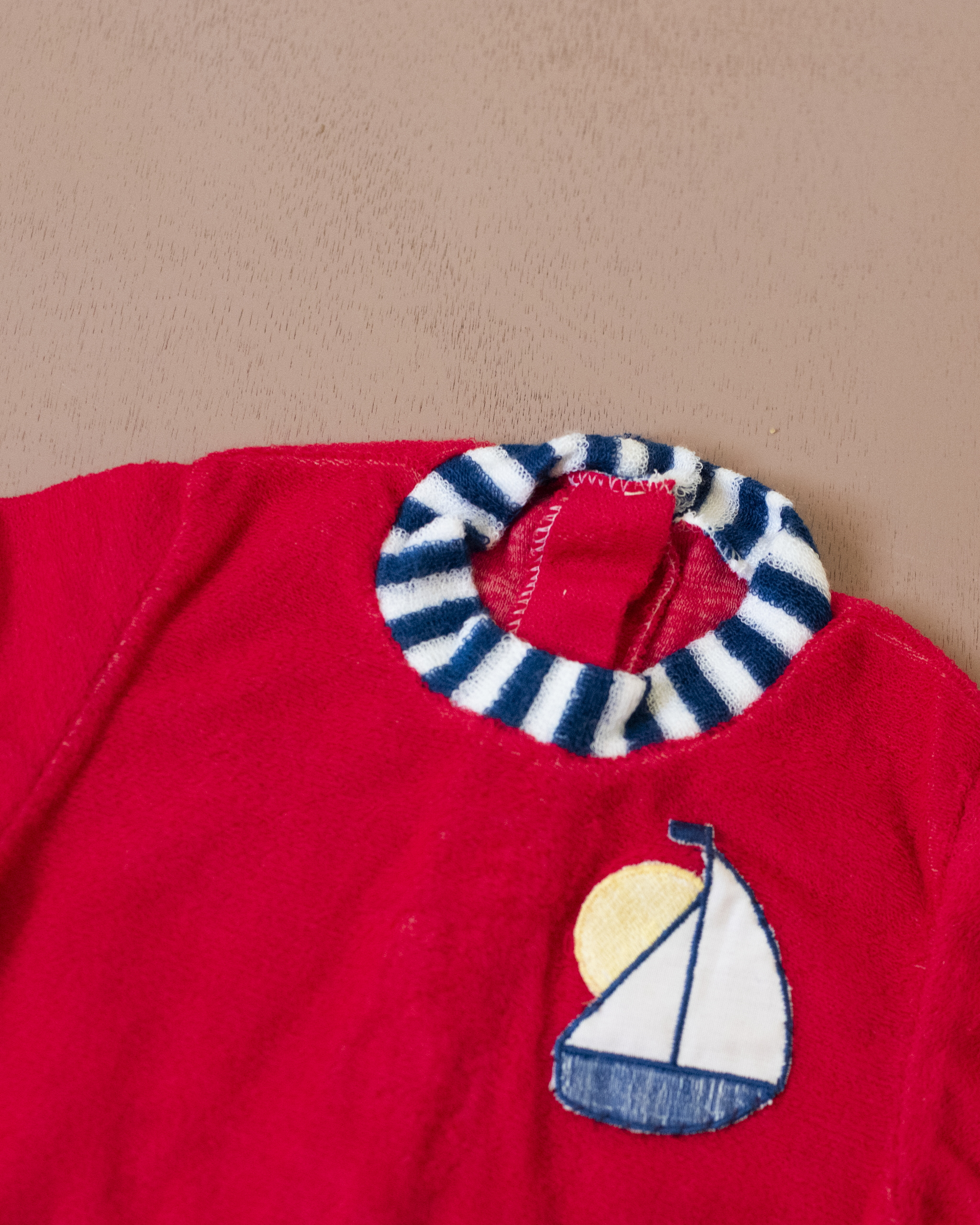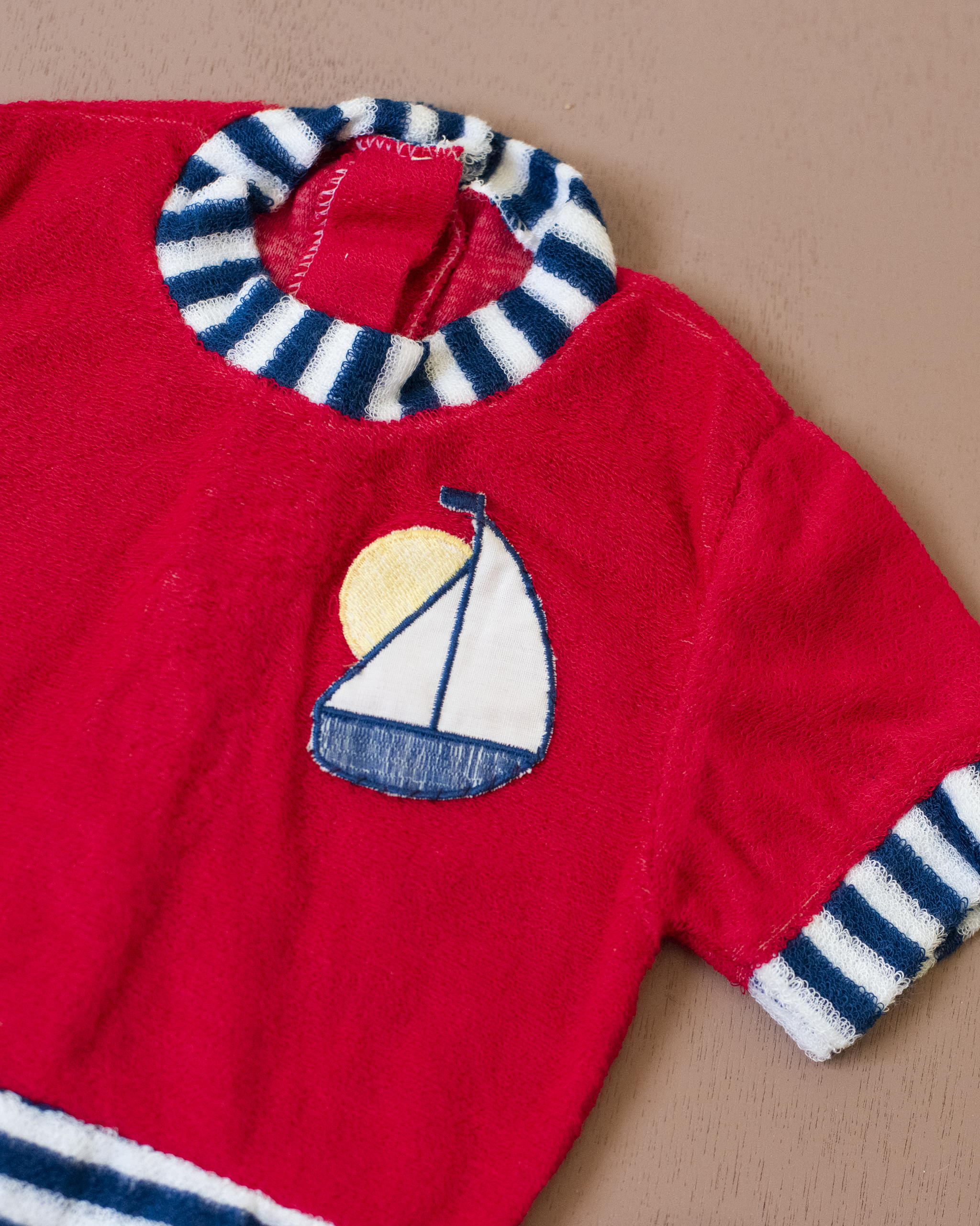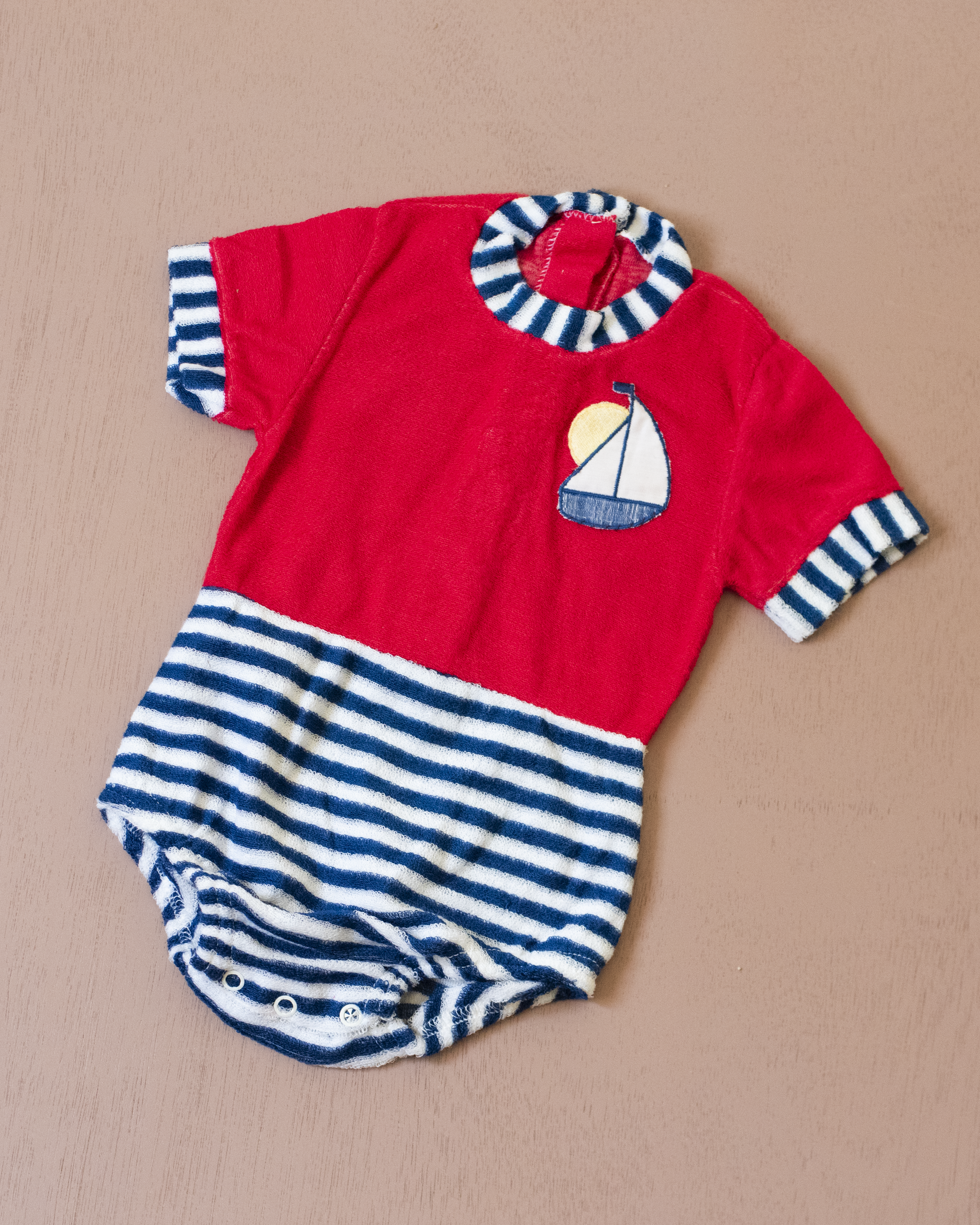אוברול מבד מגבת באדום ולבן עם פסים ומגדלור | דד סטוק ספרדי | 6-9 חודשים