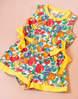 בהדפסים צבעוניים של פירות קיץ, עם כפתורים צהובים לאורך החזית