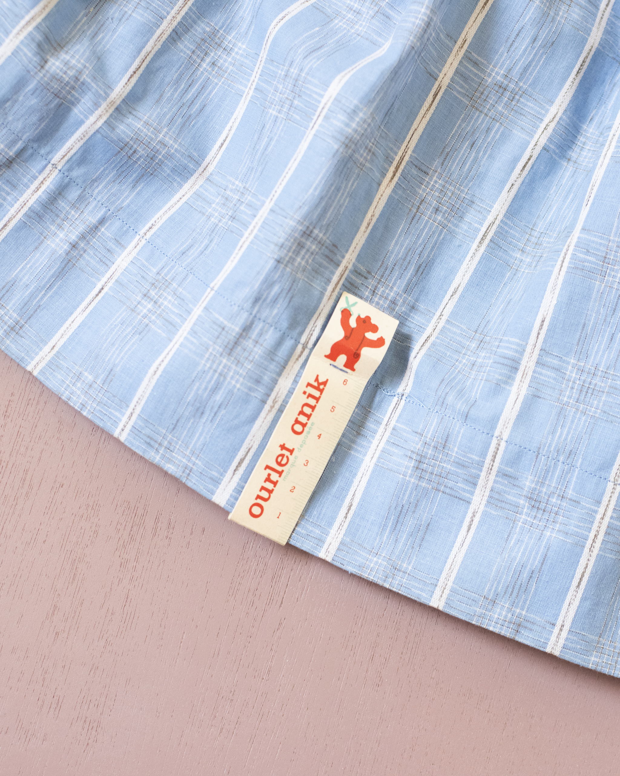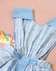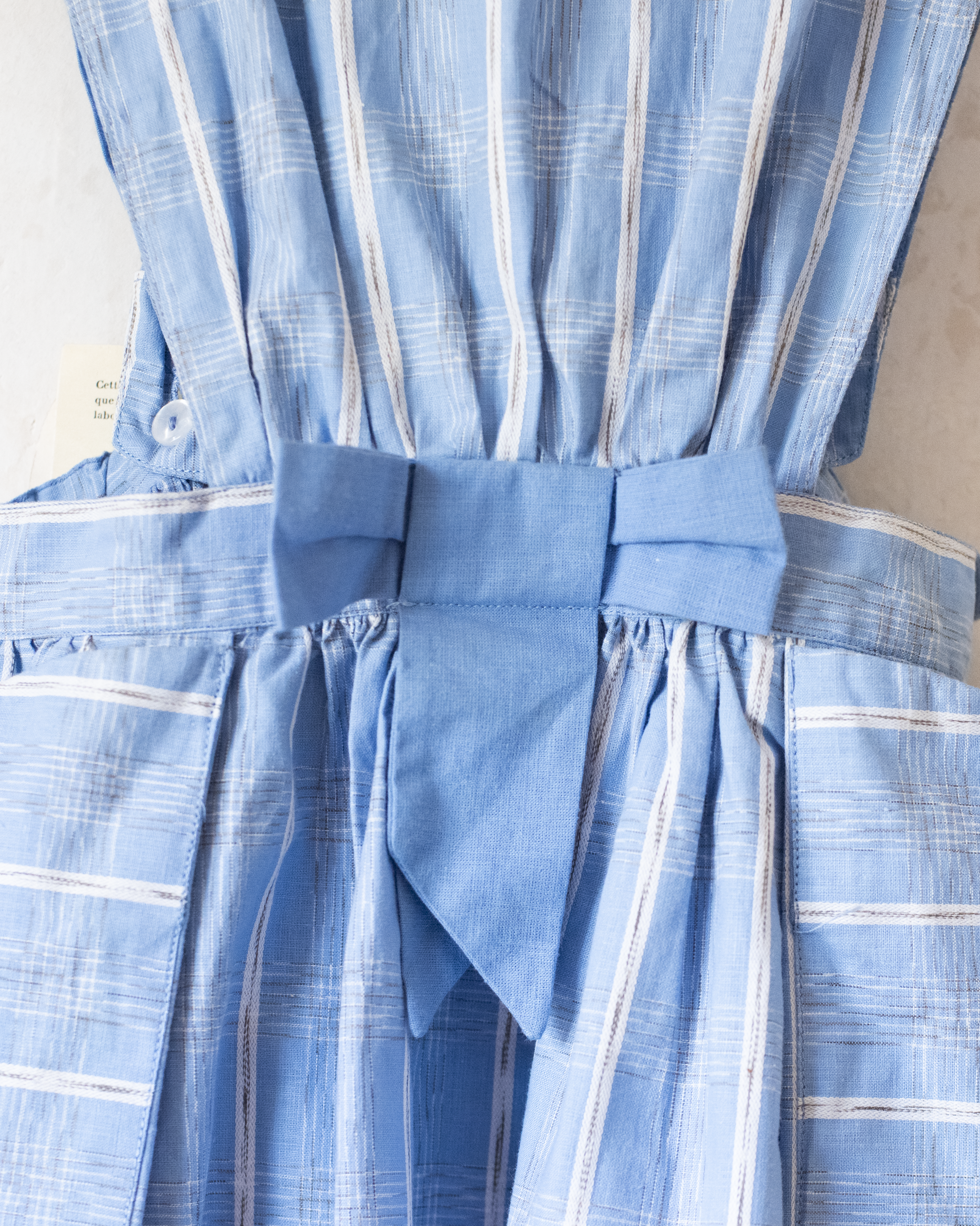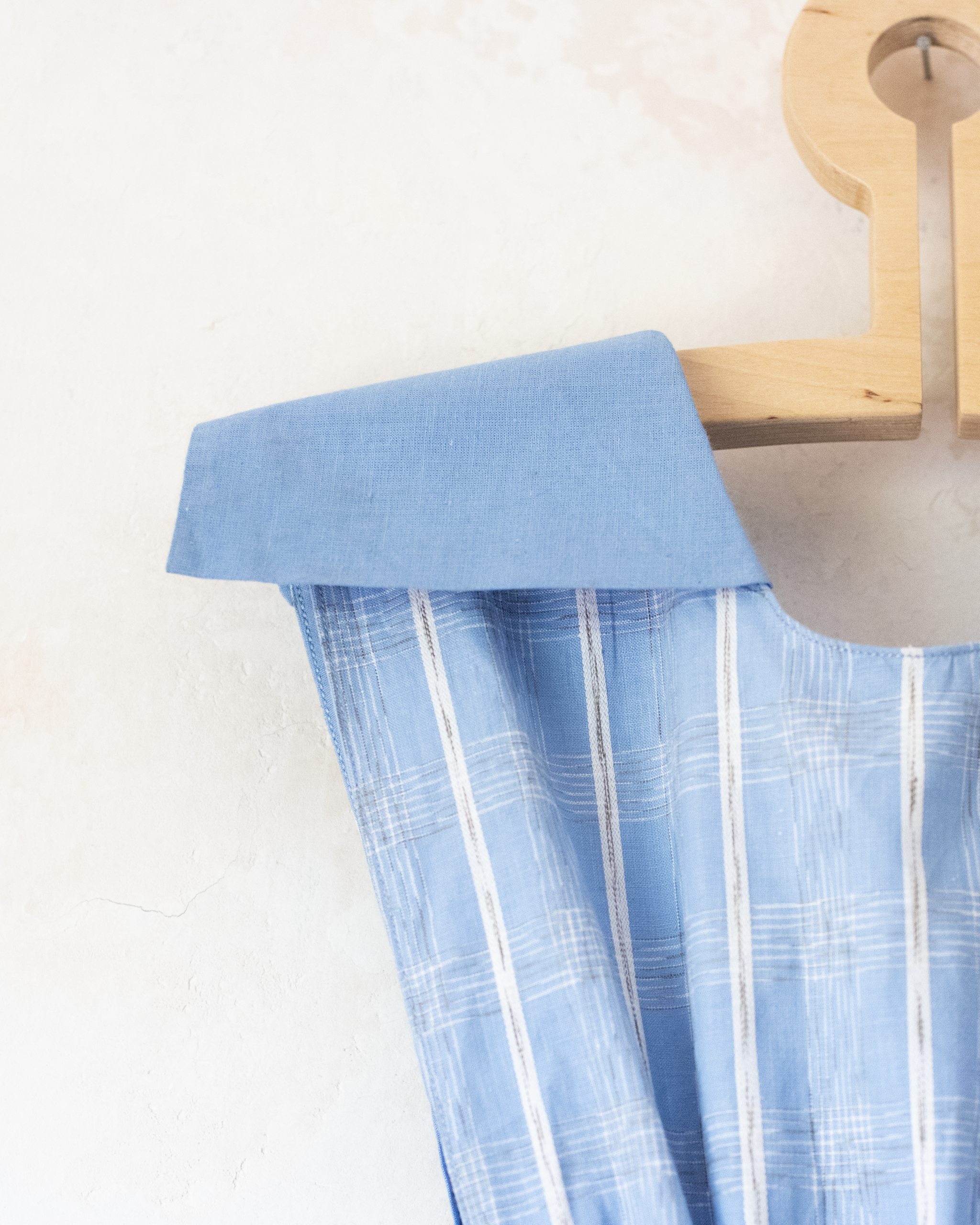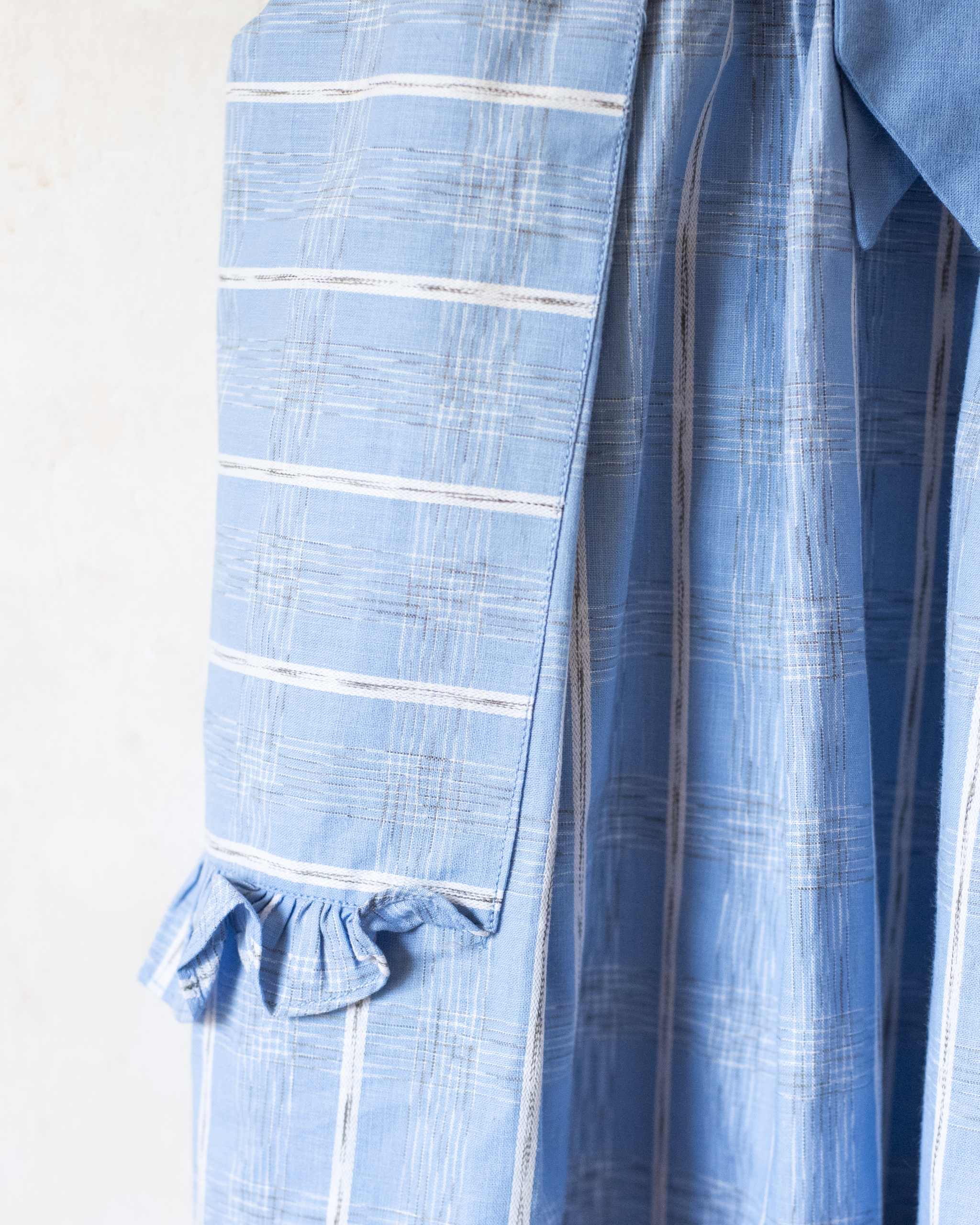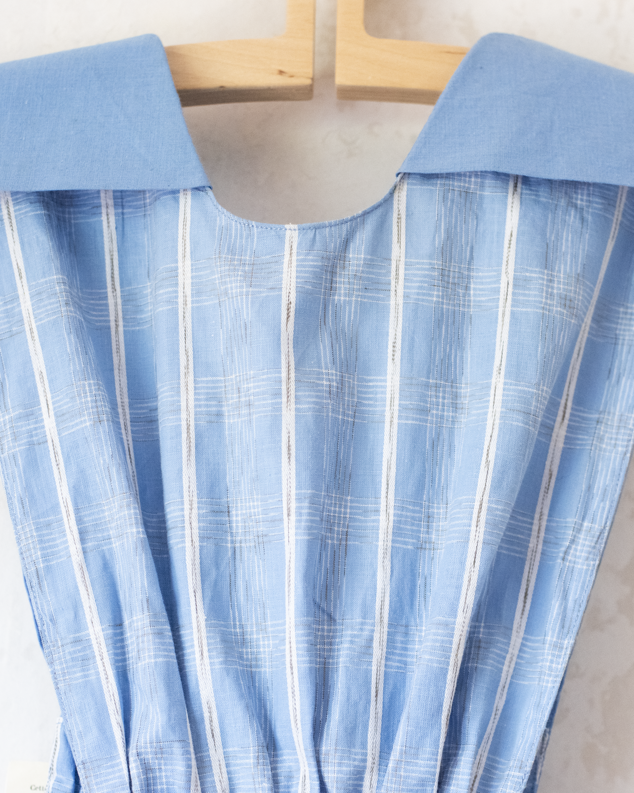 בגזרה ייחודית עם כתפיות רחבות, בצבע תכלת עם פסים דקים לבנים