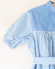 עם פסים בתכלת ולבן, חגורה דקה בגובה המותניים