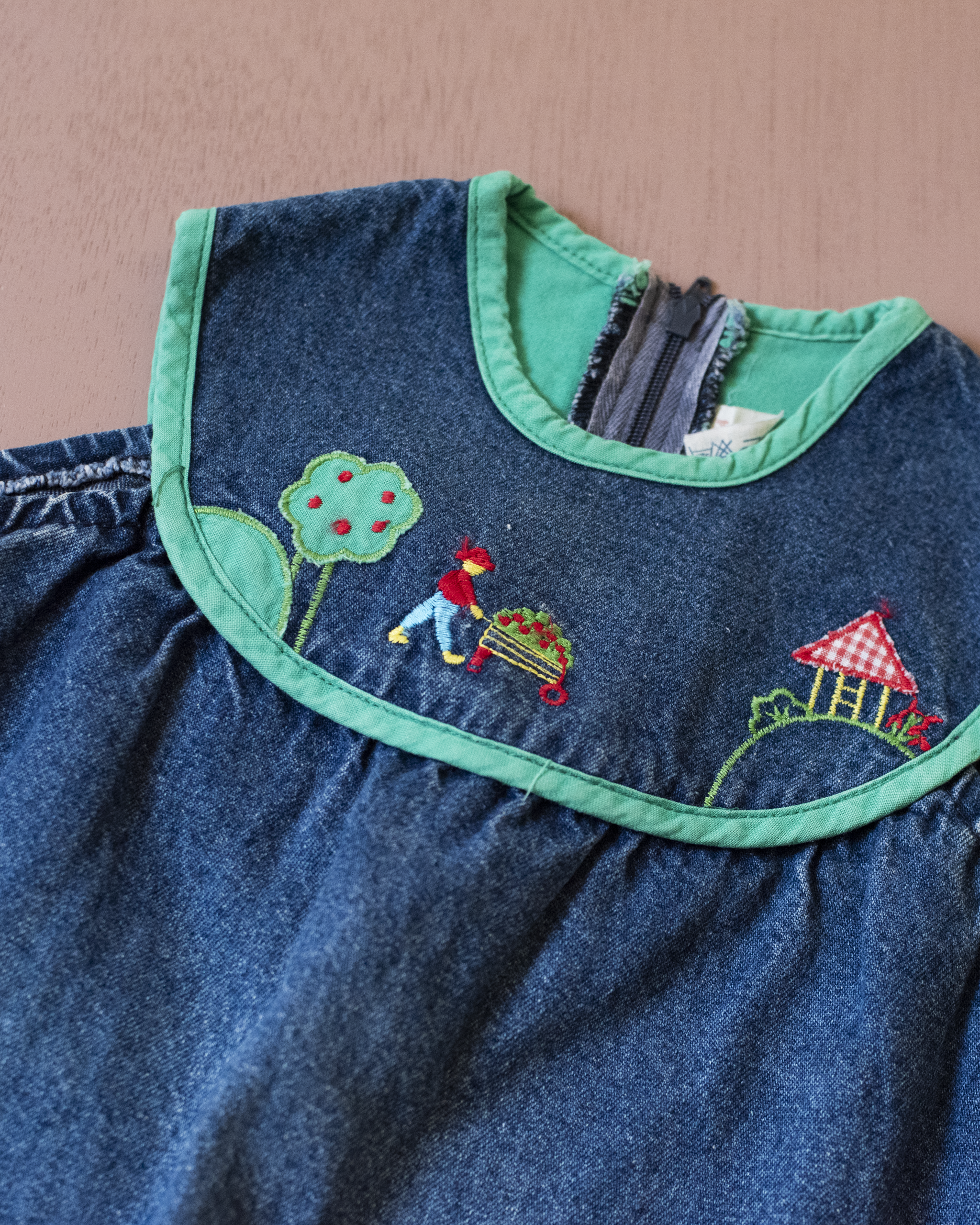 שמלת ג׳ינס עם טלאים פרחוניים | דד סטוק צרפתי מהסבנטיז | 13-14 שנים