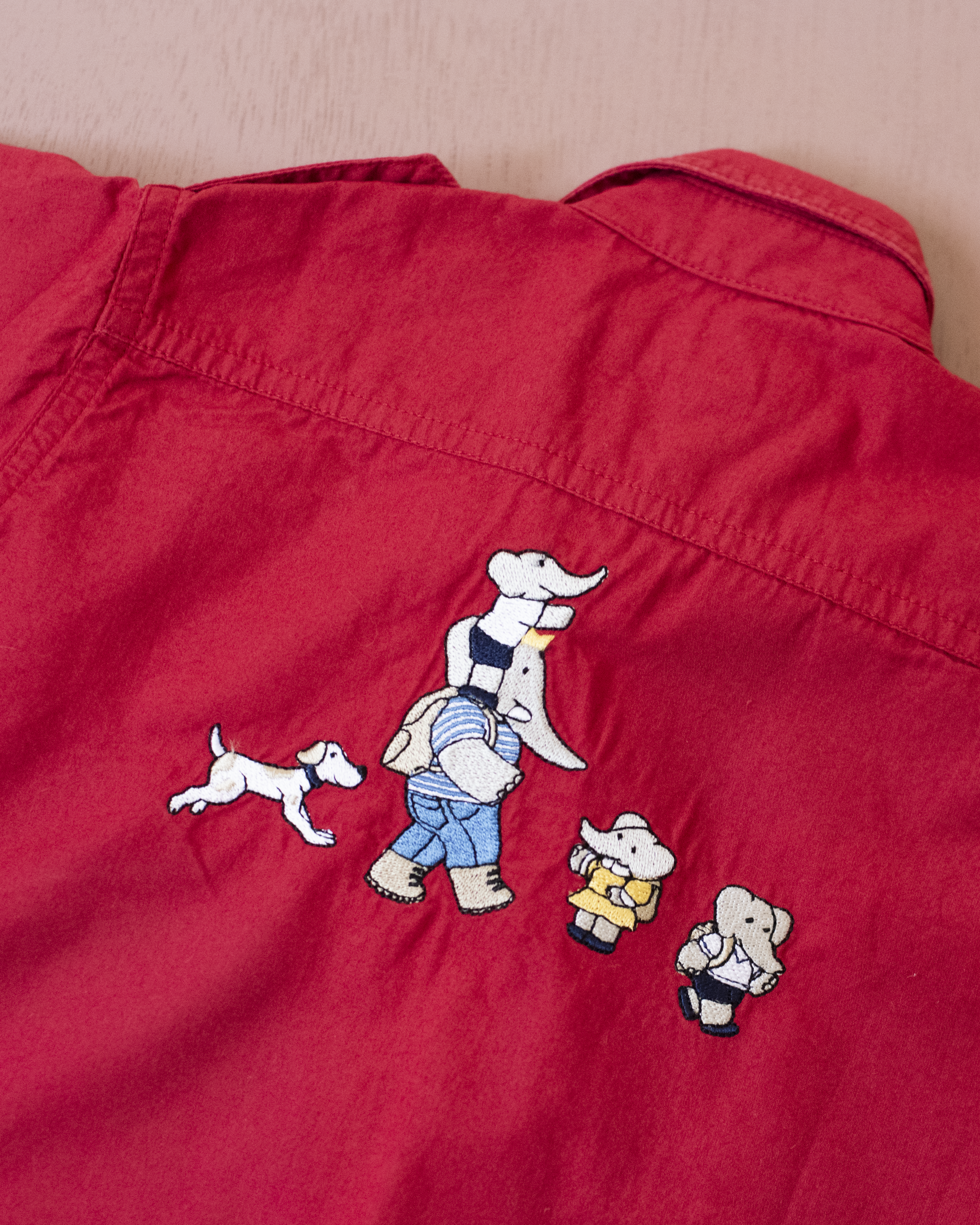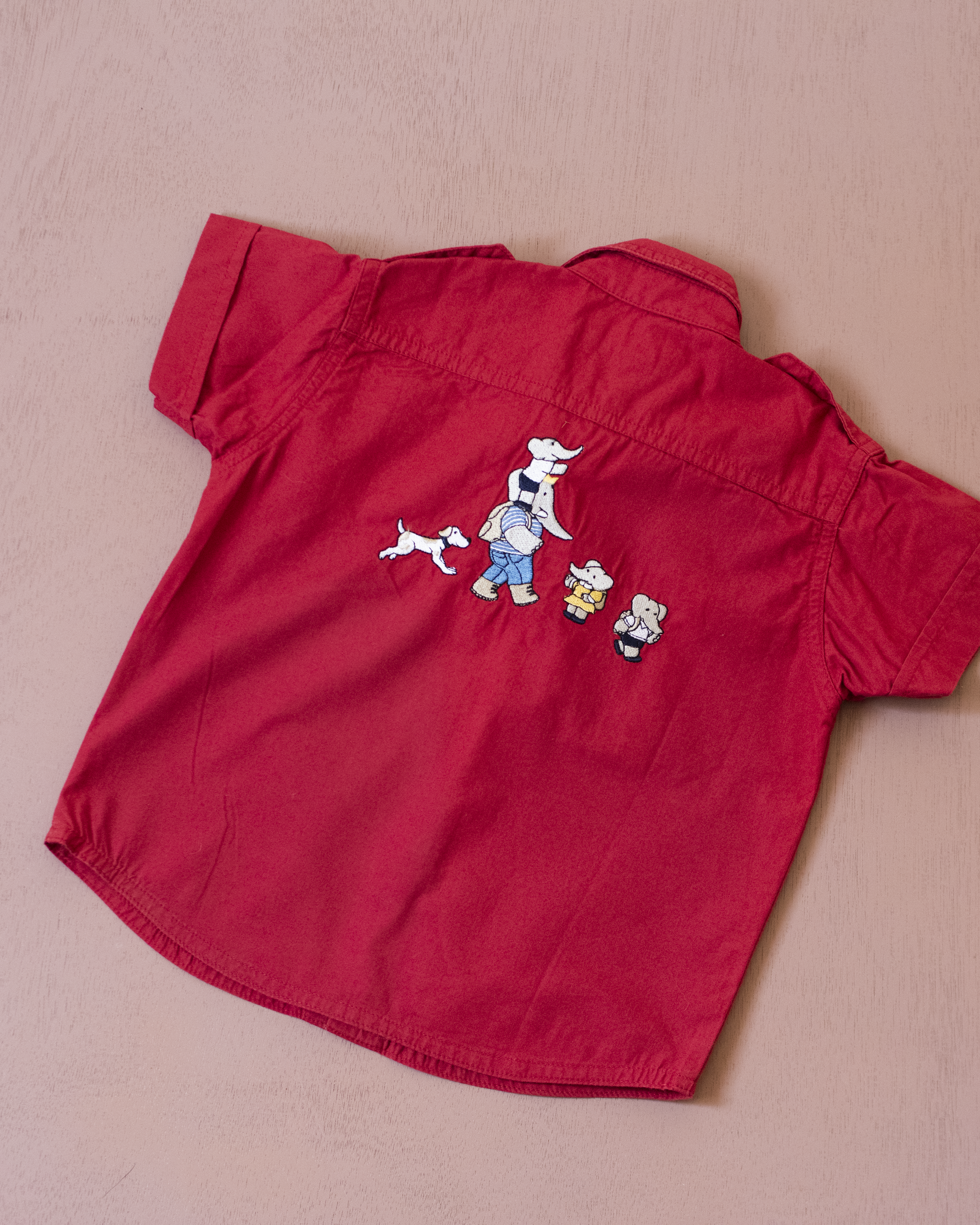 חולצה אדומה משנות ה50 עם רקמה של ילדות משחקות מחבואים | 7-8 שנים