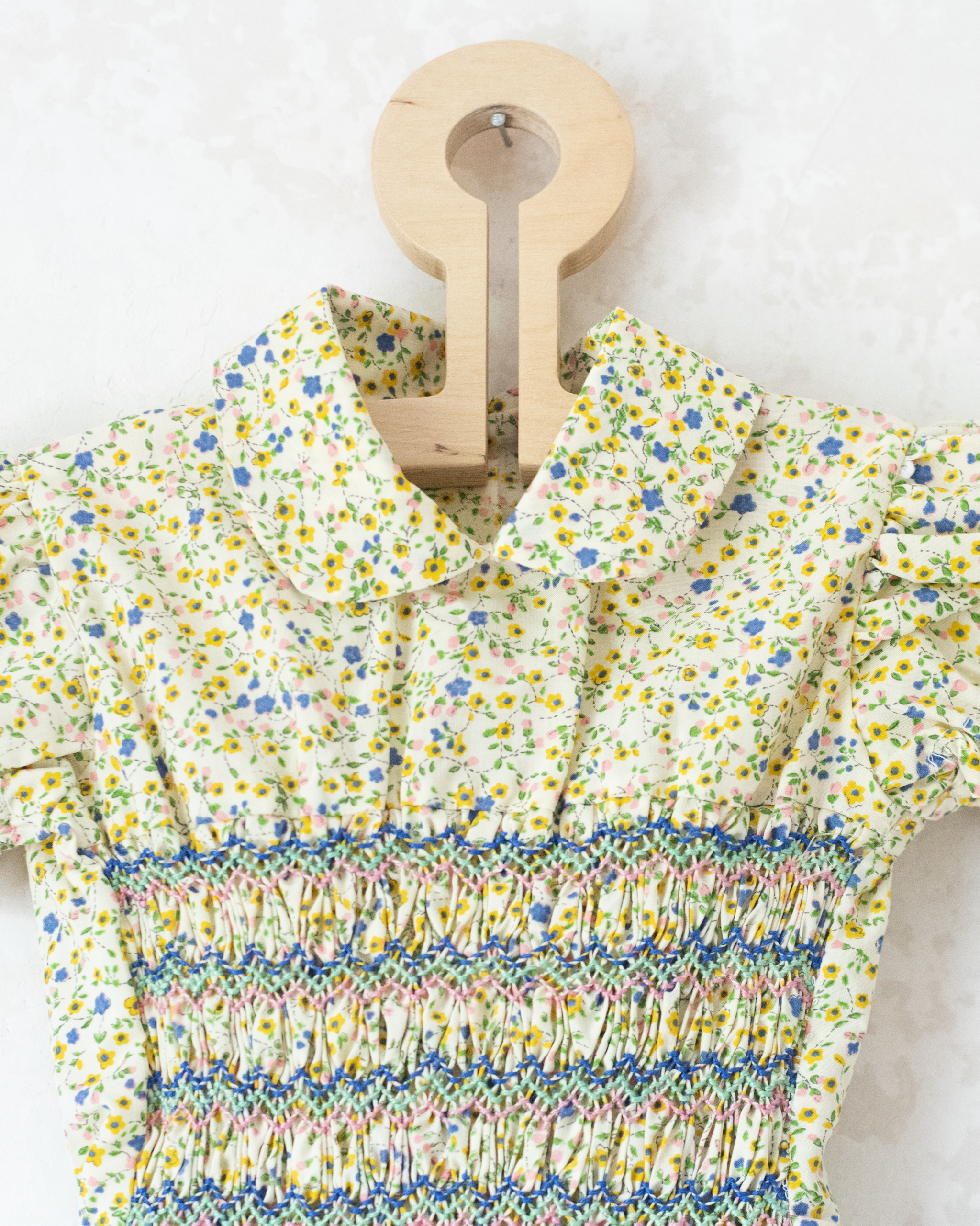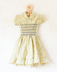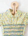 שמלת קיץ מתוקה עם שרוולים קצרים תפוחים, צווארון פיטר פן, רקמת כיווצים צבעונית עדינה