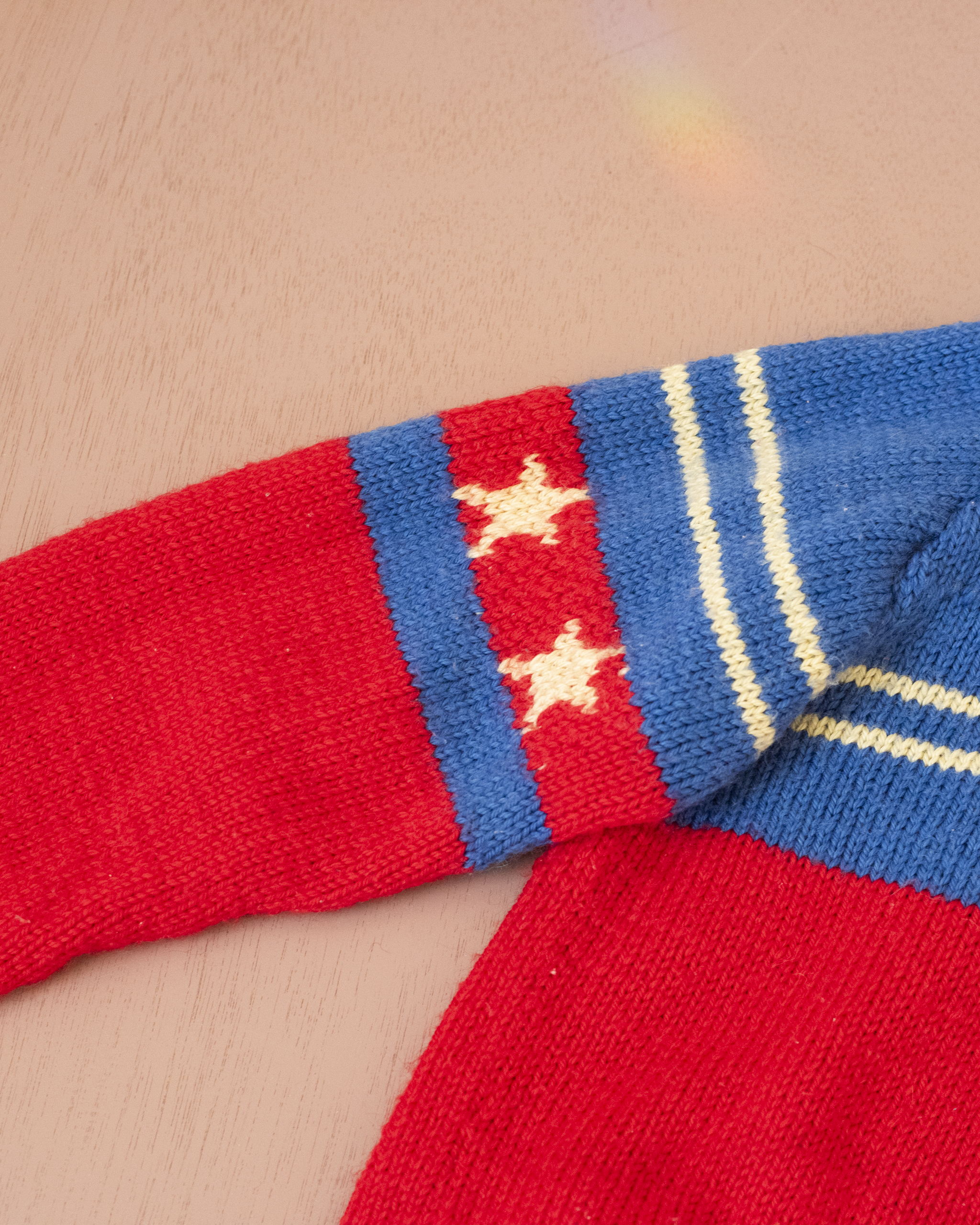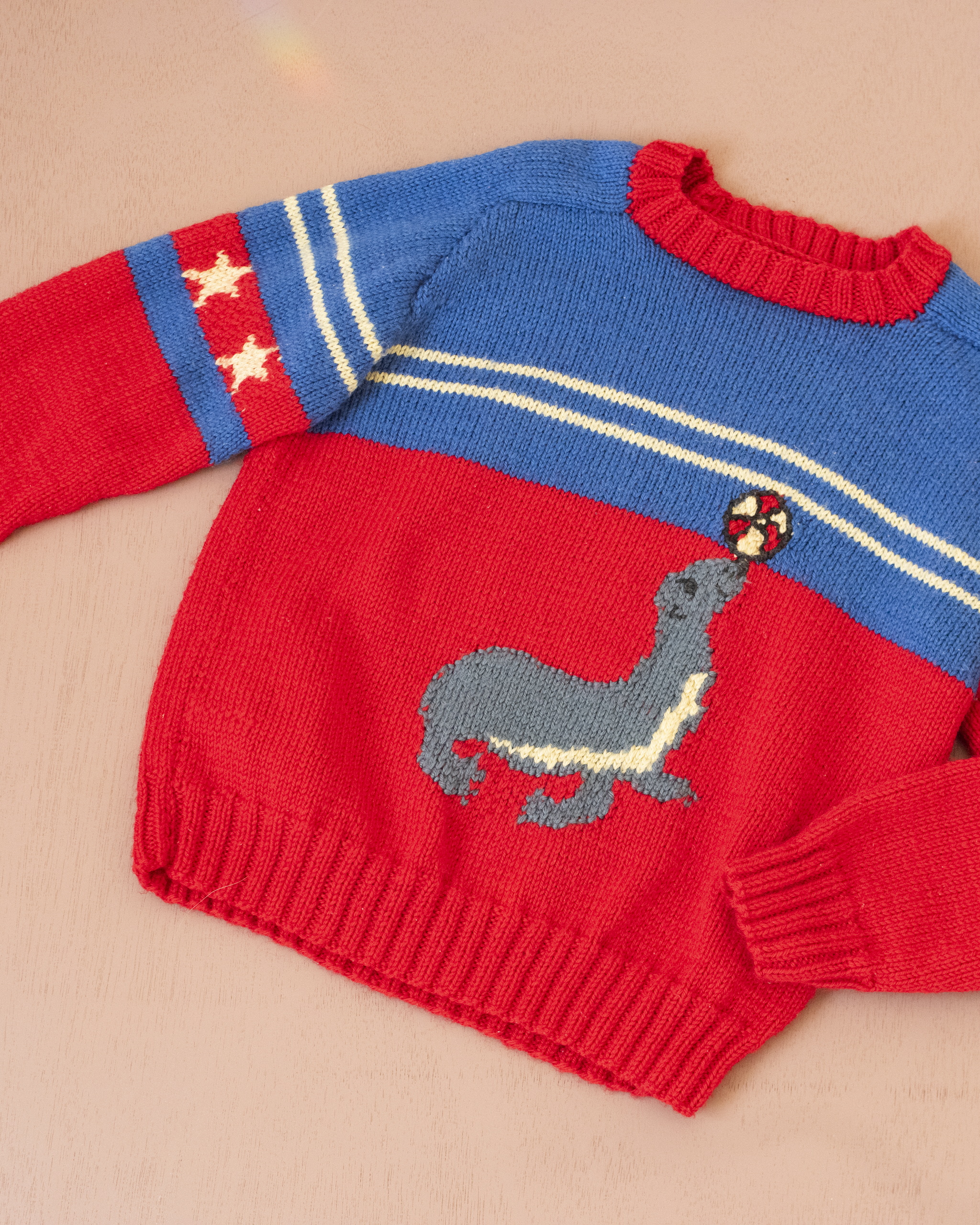 סוודר צמר אדום וכחול עם כלב ים | 5-6 שנים