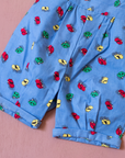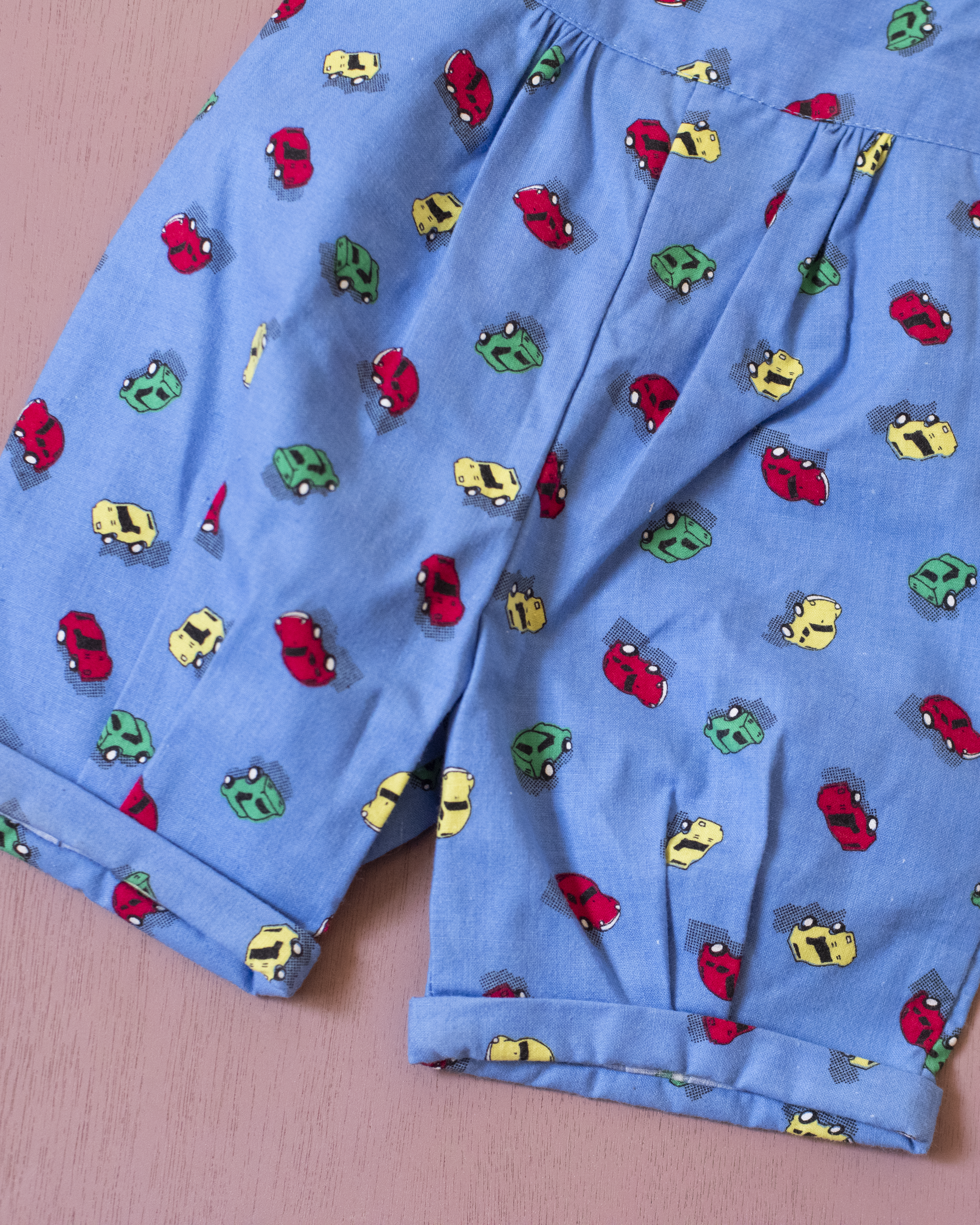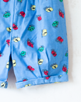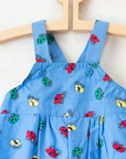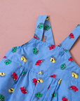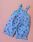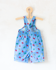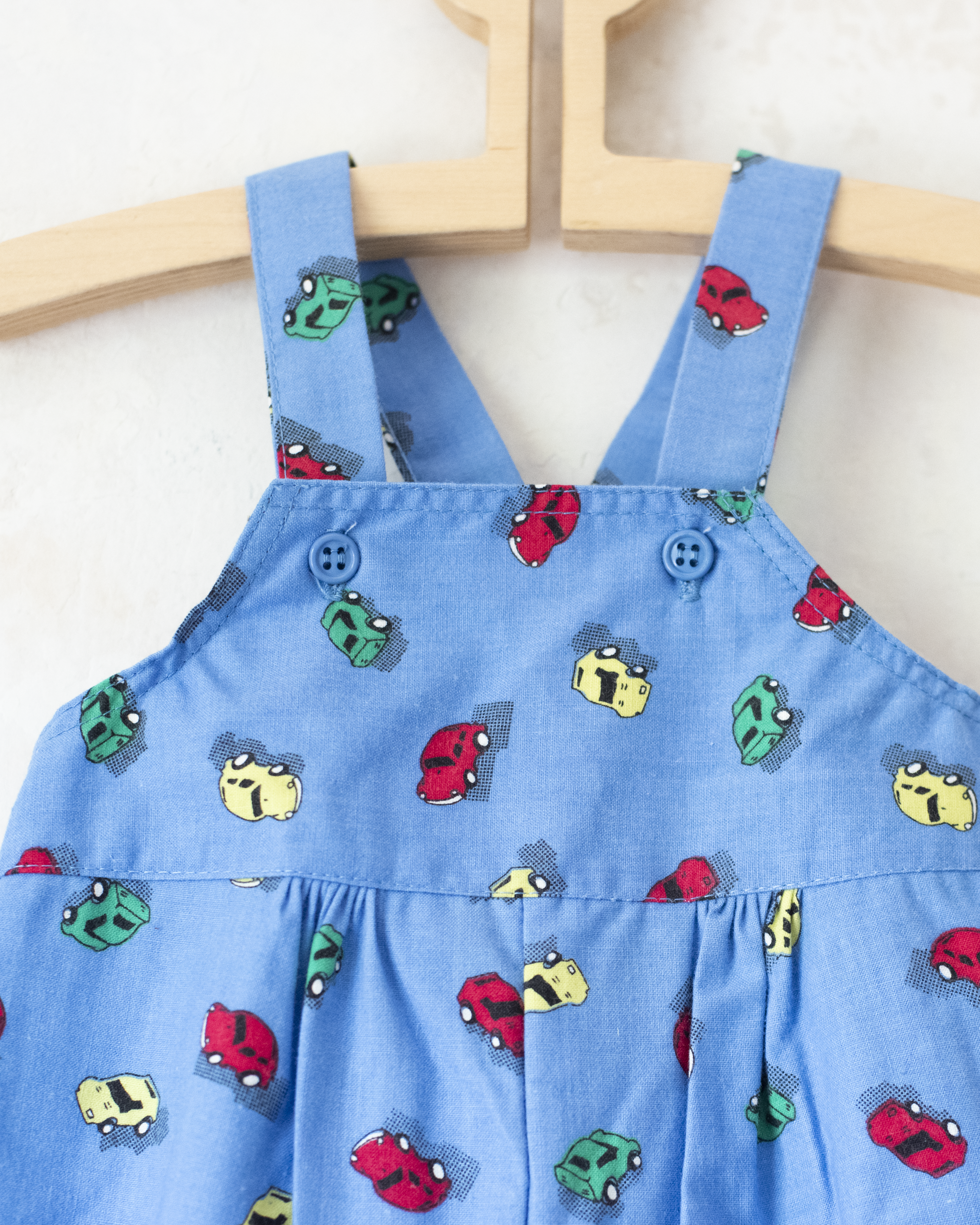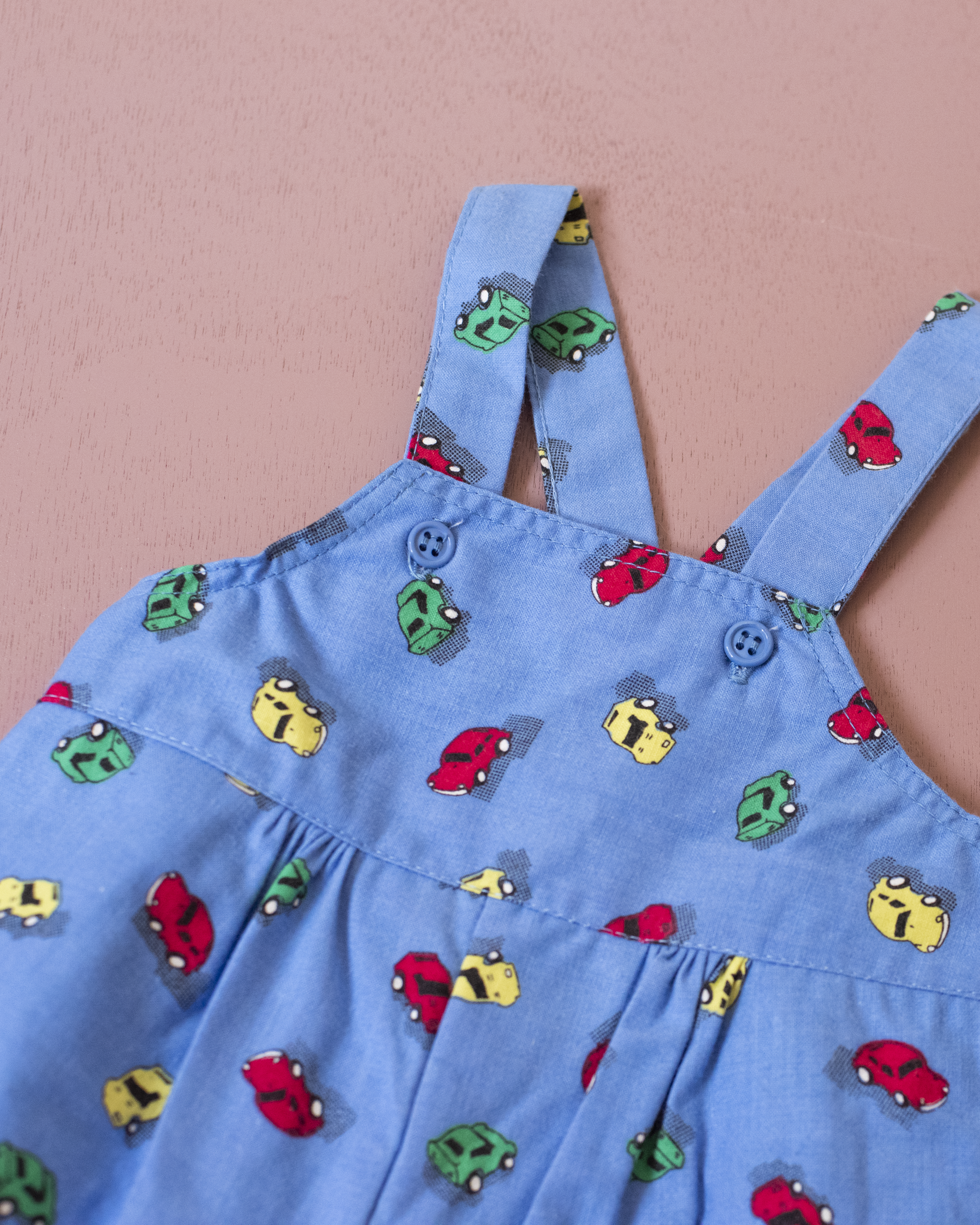 אוברול מתוק עם כתפיות דקות, בצבע כחול עם הדפס מכוניות צבעוניות