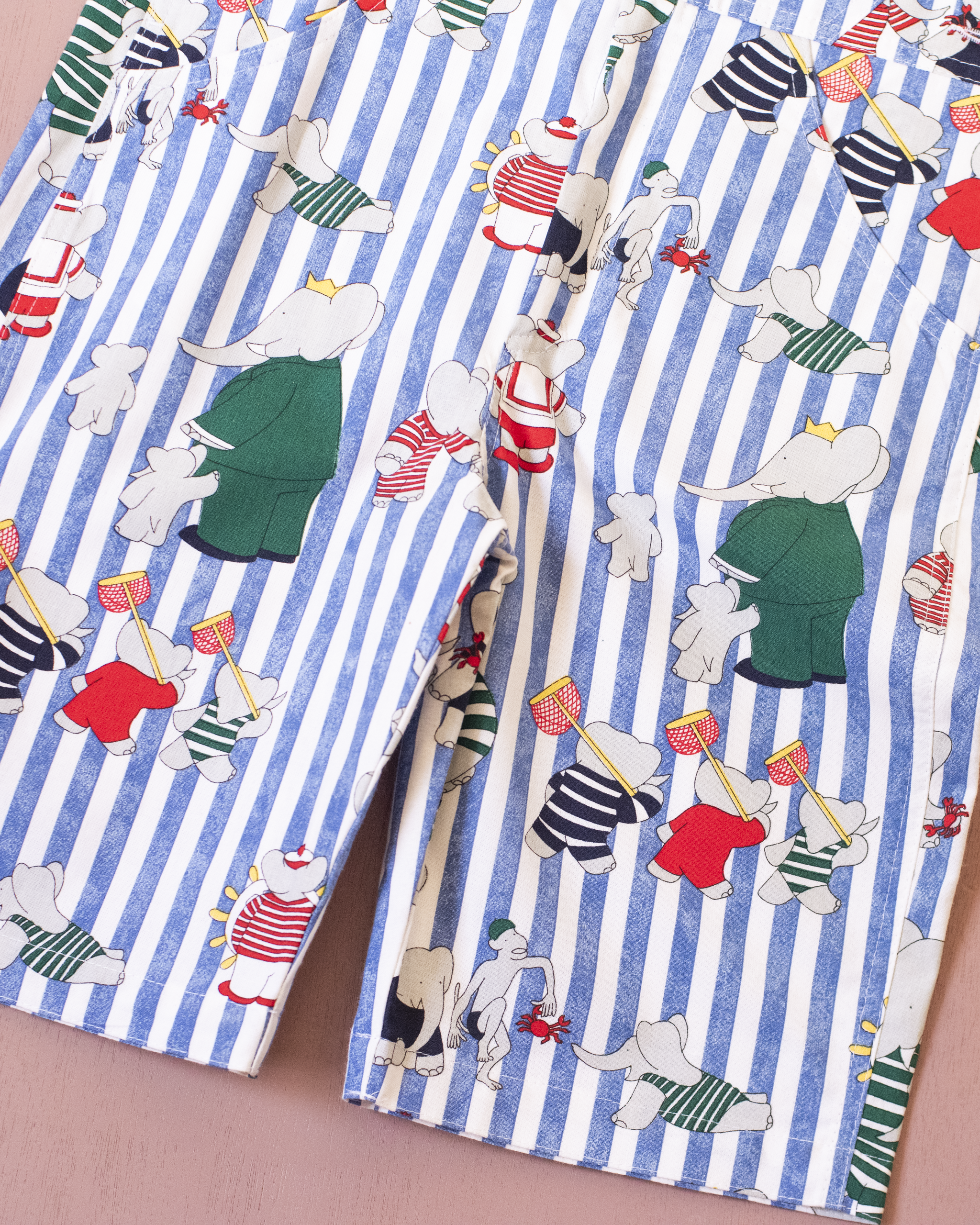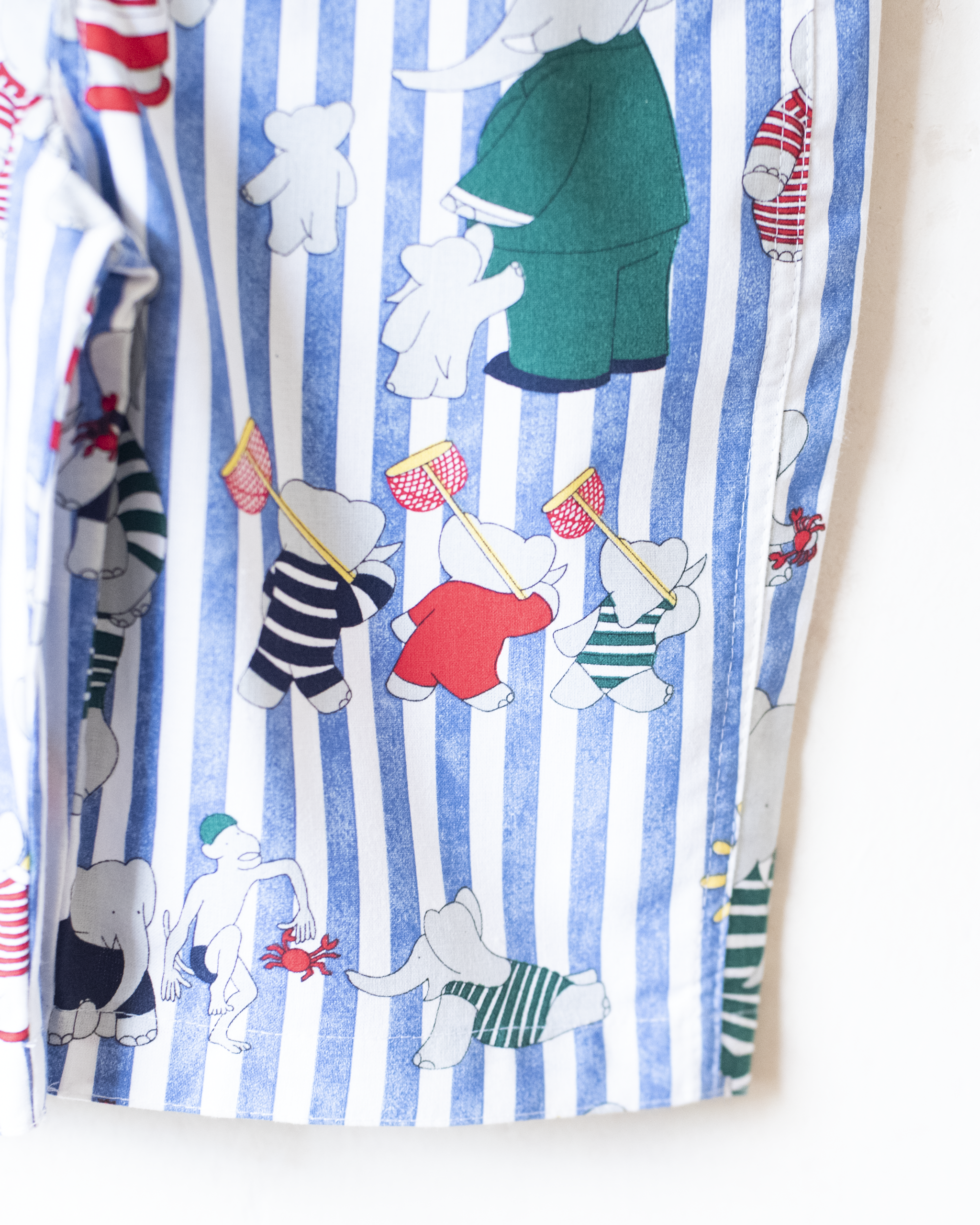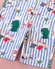 בהדפס פסים בתכלת ולבן לאורכו בשילוב הדפסים של המלך בבר וחבריו באווירת קיץ