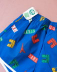 מכנסיים קצרים בגזרת אייטיז נוסטלגית בצבע כחול עם הדפסים של פריז